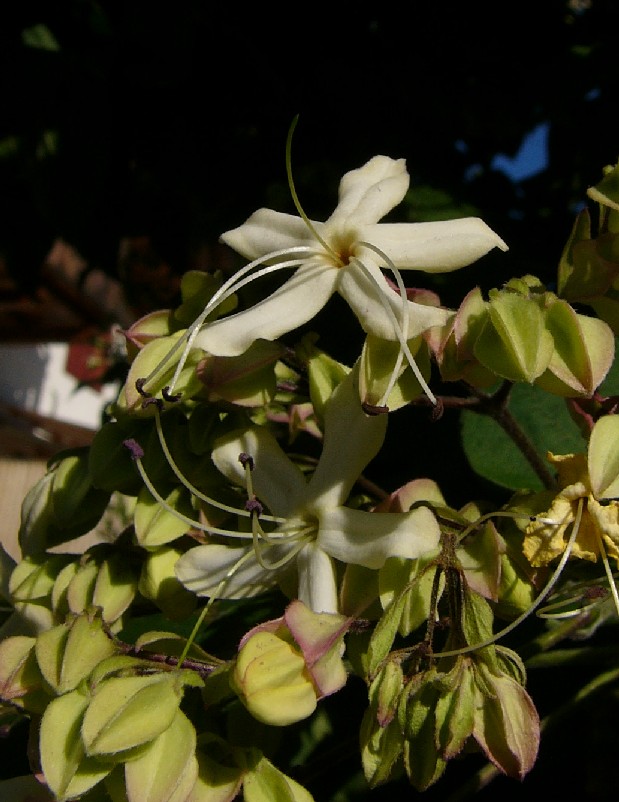 Blüten groß (3 cm), mit 5 Kronblattzipfeln, 4 Staubblätter Staubblätter und Griffel weit aus der Blüte ragend, Kelch anfangs torpedoförmig, 5- rippig > Losbaum (Clerodendrum) |