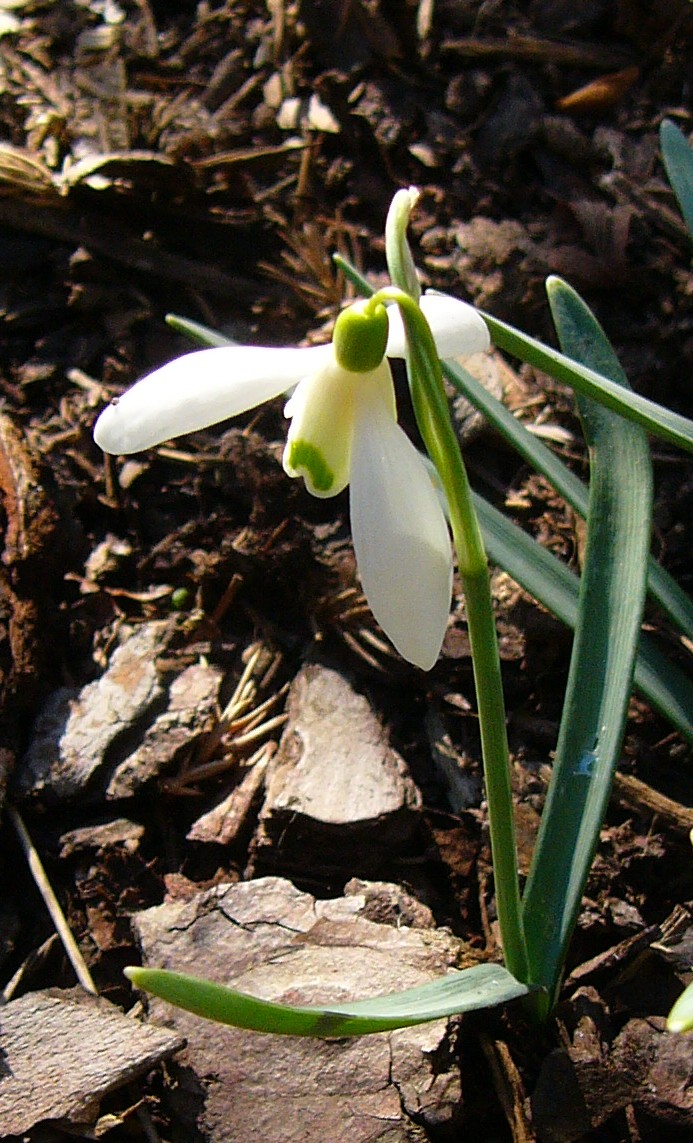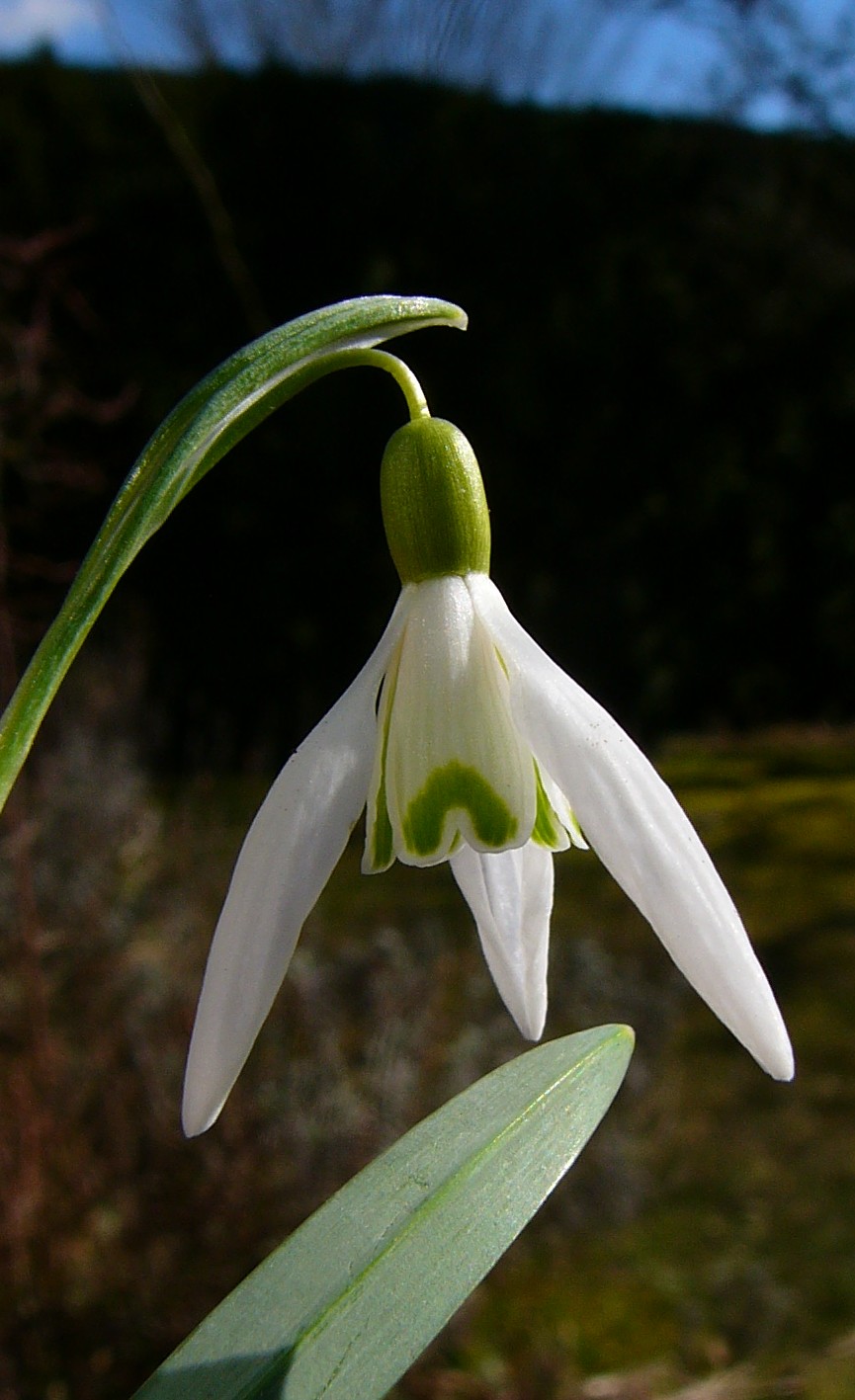 Blüten nickend, mit 6 Perigonblättern, äußere Perigonblätter lanzettlich, meist rein weiß, vorne stumpf, innere Perigonblätter viel kürzer, ausgerandet, mit grünen Flecken