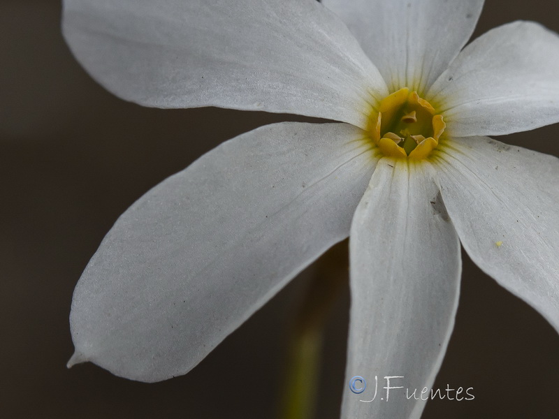 Blüten mit 6 weißen Perigonblättern, Nebenkrone ca. 1 mm hoch und 3 mm im Durchmesser, anfangs grün, später braunorange