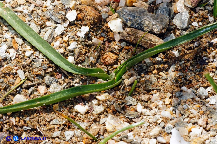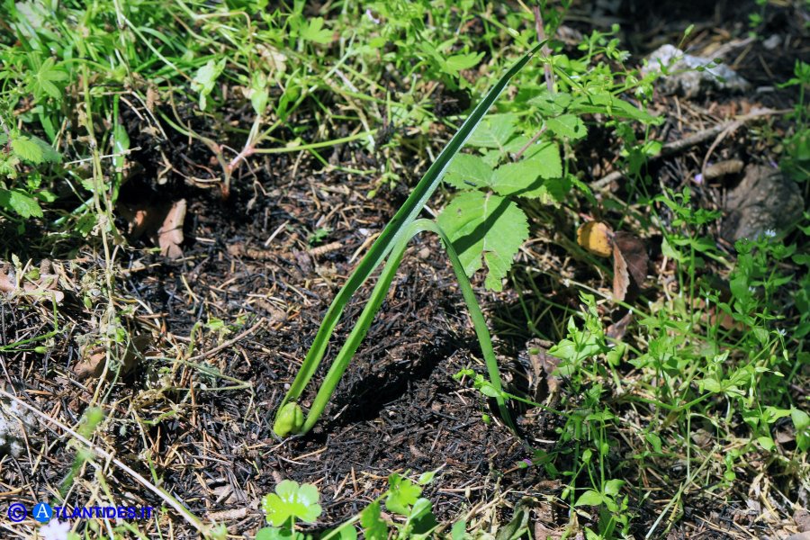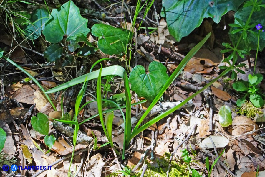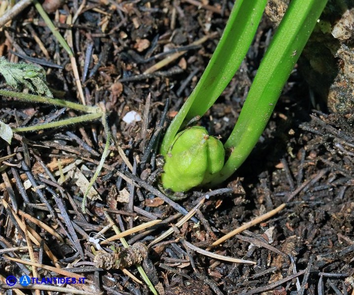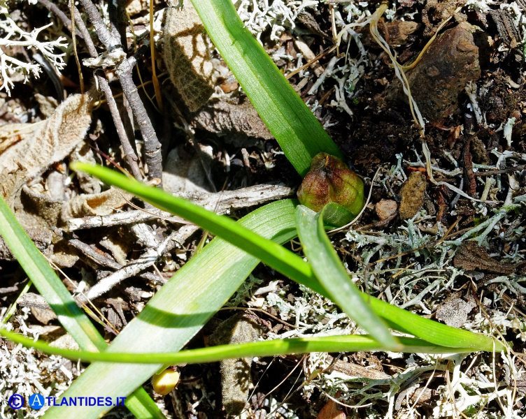 Zwiebel 10 - 25 mm lang, 10 - 15 mm breit, von dunkelbraunen, +/- membranösen Hüllen umgeben, die in einen langen Nacken auslaufend