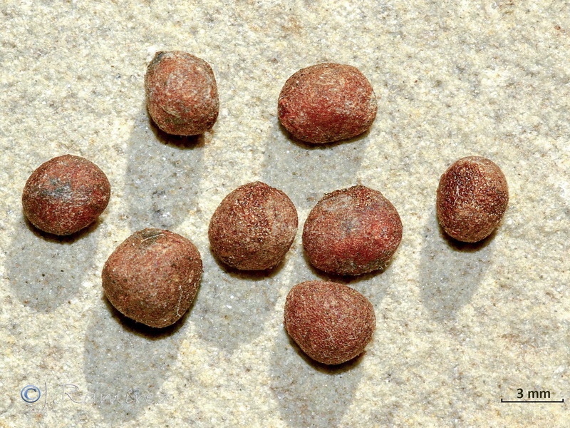 Samen elliptisch oder kugelig, fein warzig, meist rotbraun am Nabel (Hilum) heller