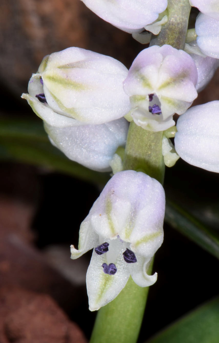 Blütenstand zylindrisch, mit 22 - 39 Blüten, 5 - 9,5 cm lang, Blütenknospen weiß, grün gestreift, an der Spitze schmutzig violett, Blütenstiele violett, zur Blütezeit 5 - 11 mm lang, kürzer als die Blüten