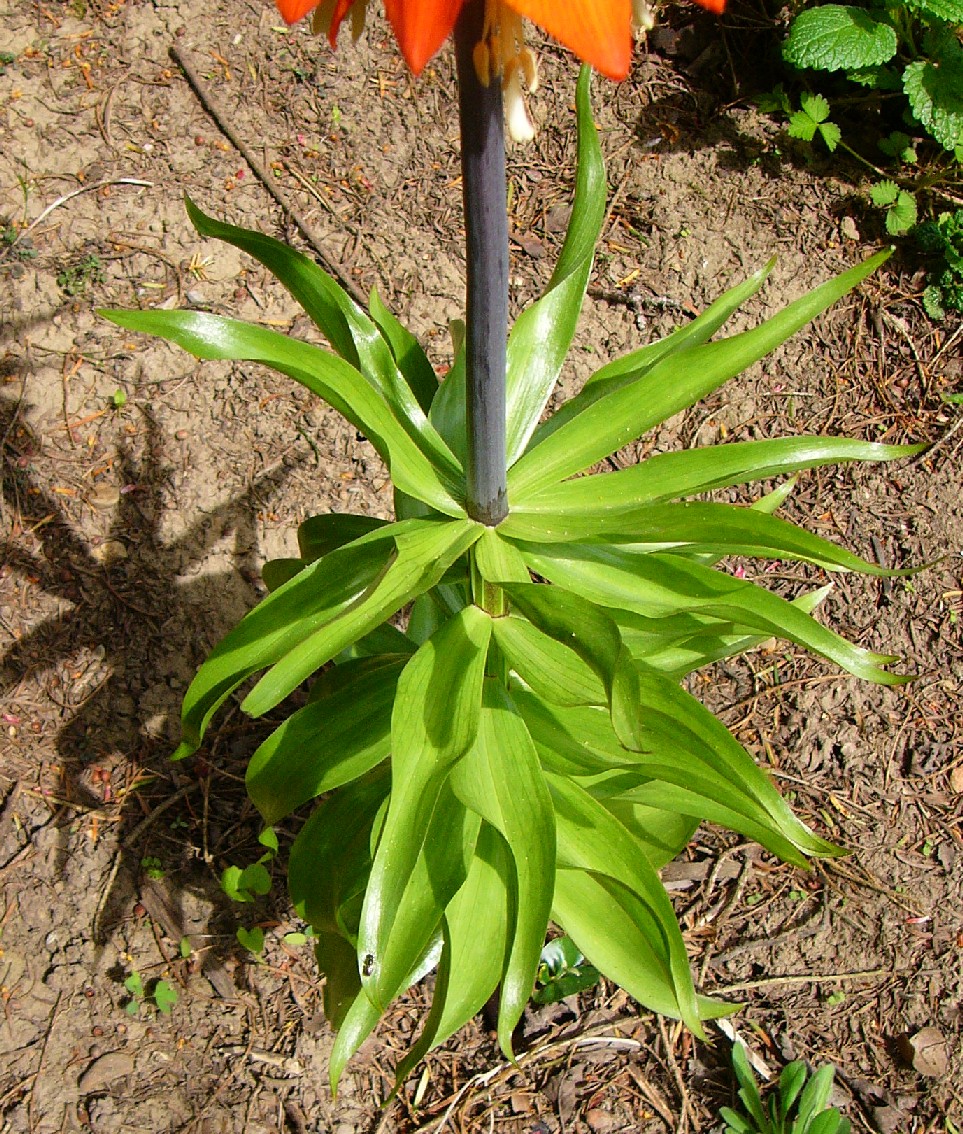 Stängel schwarzviolett, bereift Laubblätter quirlig, linealisch- lanzettlich, parallelnervig Zwiebeln bis zu 10 cm im Durchmesser