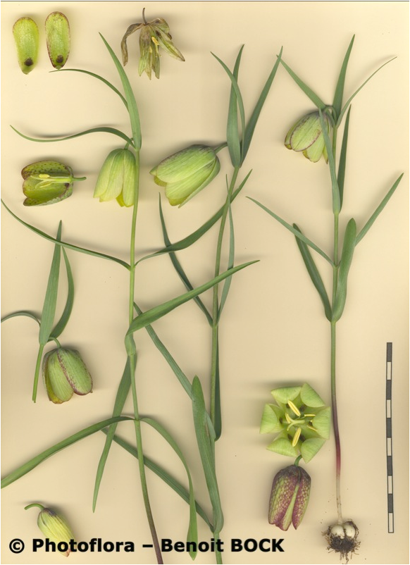 Blüten hängend, breit glockig, grün, mit braunrotem Schachbrettmuster