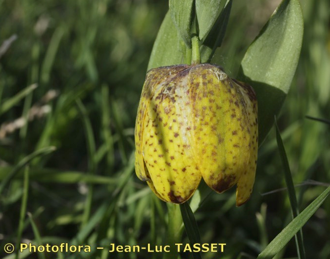 Blüten meist einzeln, seltener zu zweit, glockig, hängend, gelb, mit braunem Schachbrettmuster, am Hals eckig, dadurch im Umriss rechteckig erscheinend, Perigonblätter 40 - 45 mm lang, vorne stumpf, oft bereift