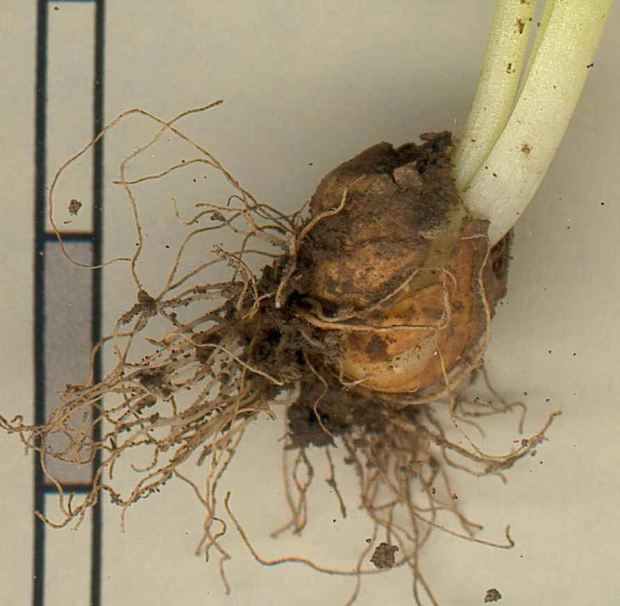 Zwiebel 5 - 10 cm im Durchmesser, mit braunen