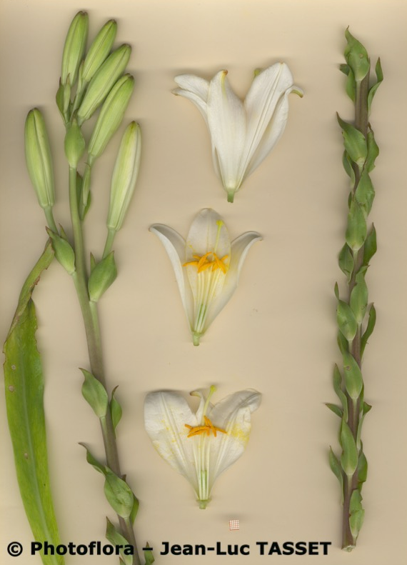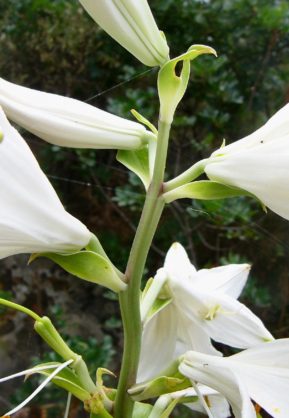 Perigonblätter bis 80 mm lang, reinweiß, kaum zurückgebogen, Griffel hellgrün,