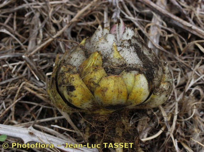 Zwiebel breit oval, bis 9 cm im Durchmesser, mit