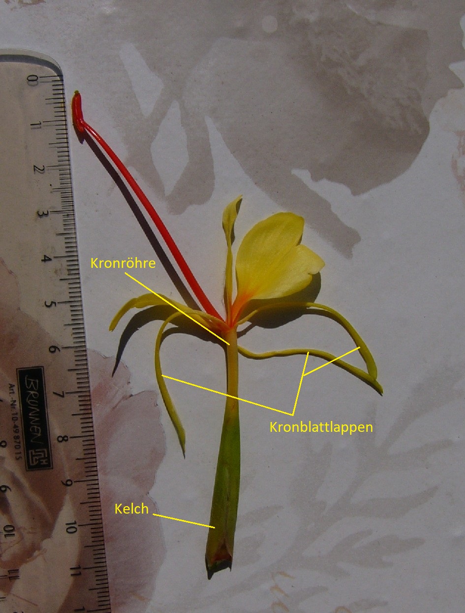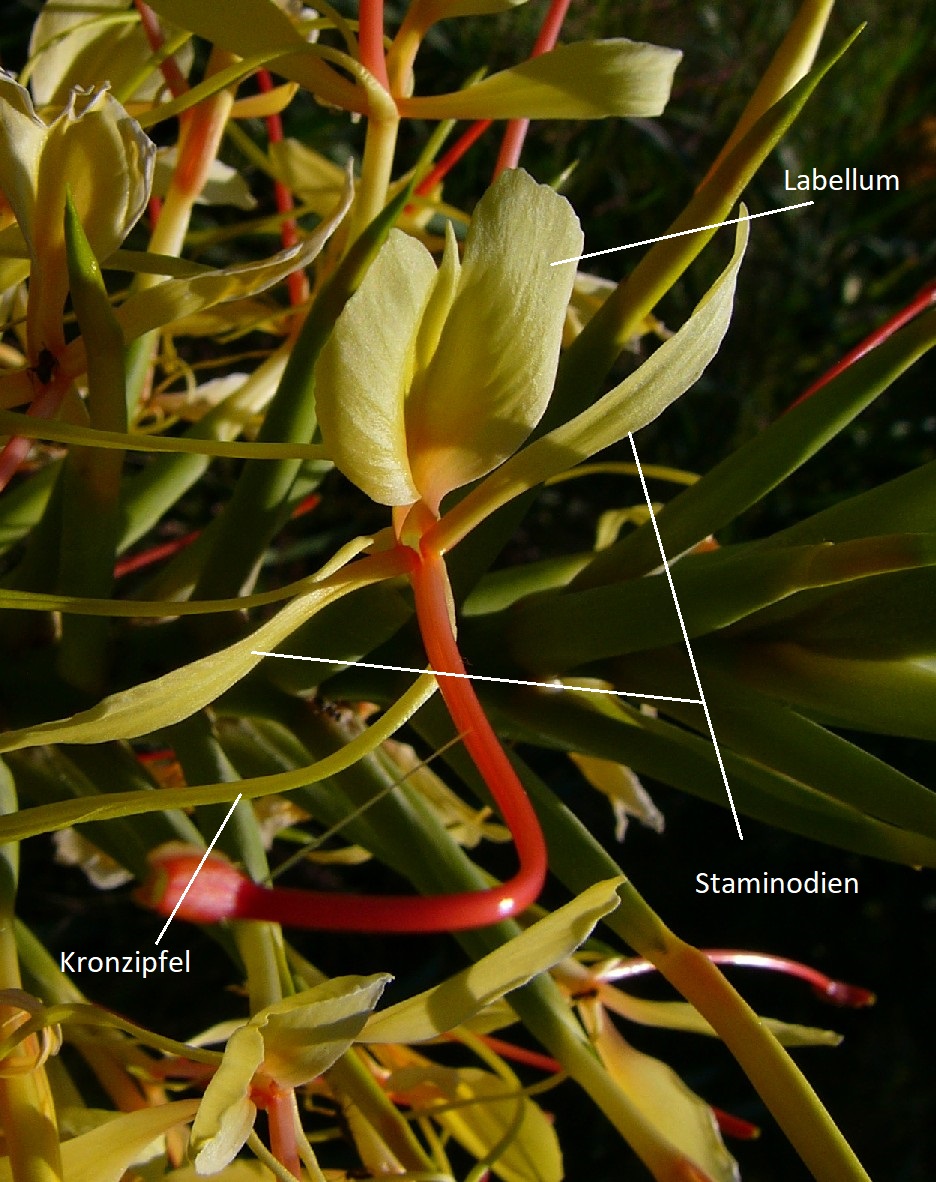 Blüten gelb, zygomorph, mit 3 Kronblättern, die an ihrer Basis zu einer langen, engen Röhre verwachsen sind und 3 linealischen Kronblattlappen, die nach dem Aufblühen zurückgebogen sind,