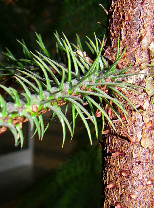 Altere Nadeln mit hornartiger Spitze, einwärts gekrümmt, kürzer als bei Jungtrieben