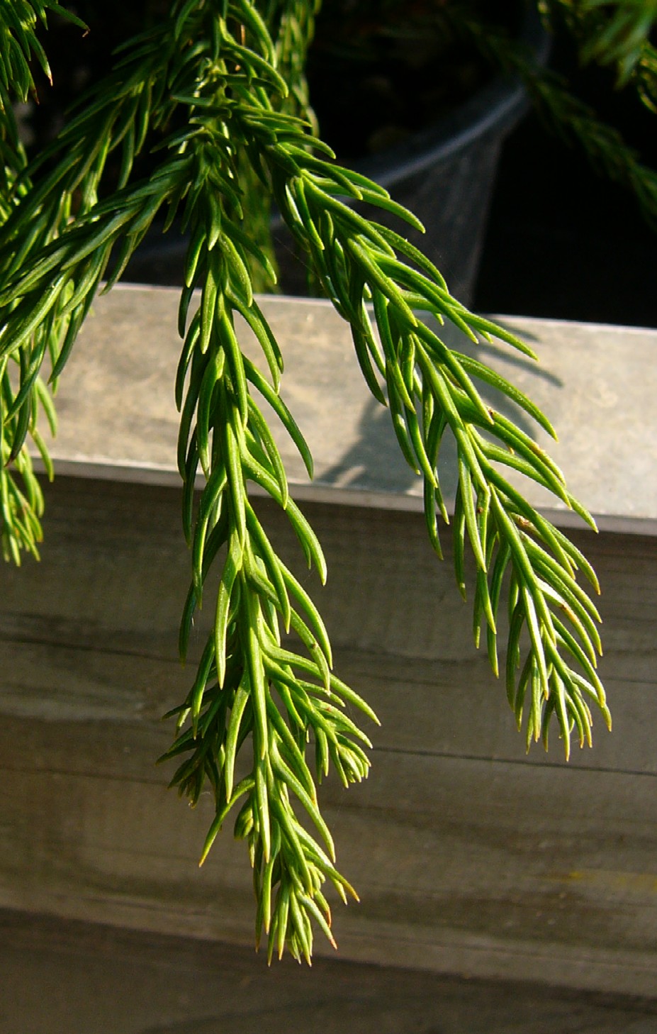 Blätter in 5 Längsreihen, schraubig um den Zweig angeordnet, hart, gekrümmt
