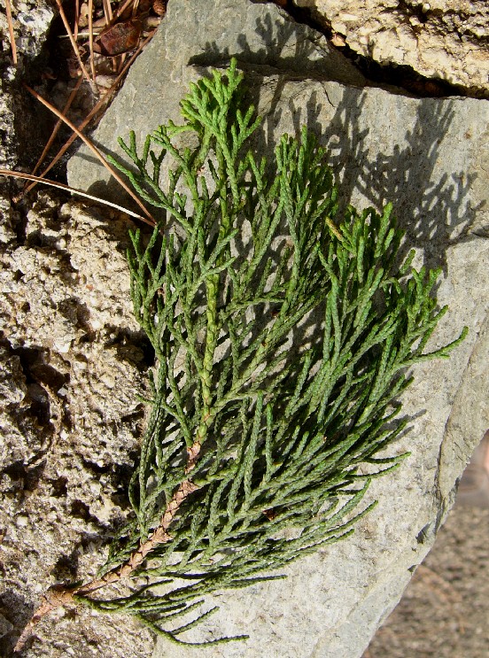 Borke grau oder rötlichbraun, faserig, mit Längsstruktur