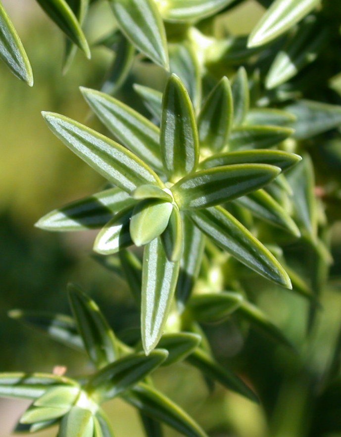 nadelförmig, +/- stechend, in 3- blättrigen Quirlen