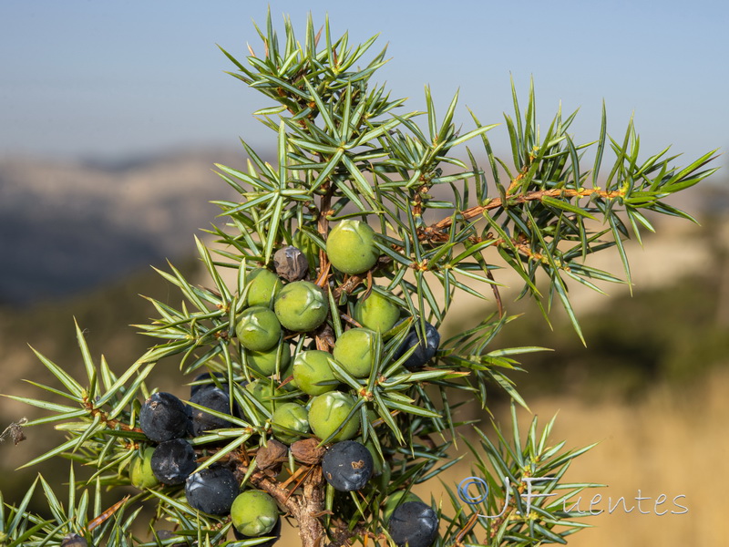 Die Entwicklung bis zur reifen, fleischigen Beere dauert 3 Jahre, Beeren anfangs grün, später blau oder schwarz, von den zugehörigen Nadeln überragt