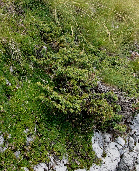 | Niederliegender bis 80 cm hoher Strauch Nadeln nach oben gebogen, 4 - 8 mm lang, wenig stechend > 1