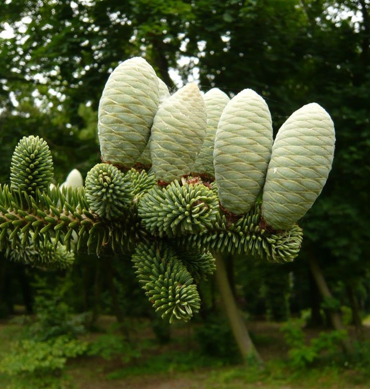 Zapfen gehäuft an der Baumspitze, 8-14 cm lang, erst blaugrün, später trüb-violett, bleiben am Baum und fallen nicht herunter, Fruchtreife: VIII - IX
