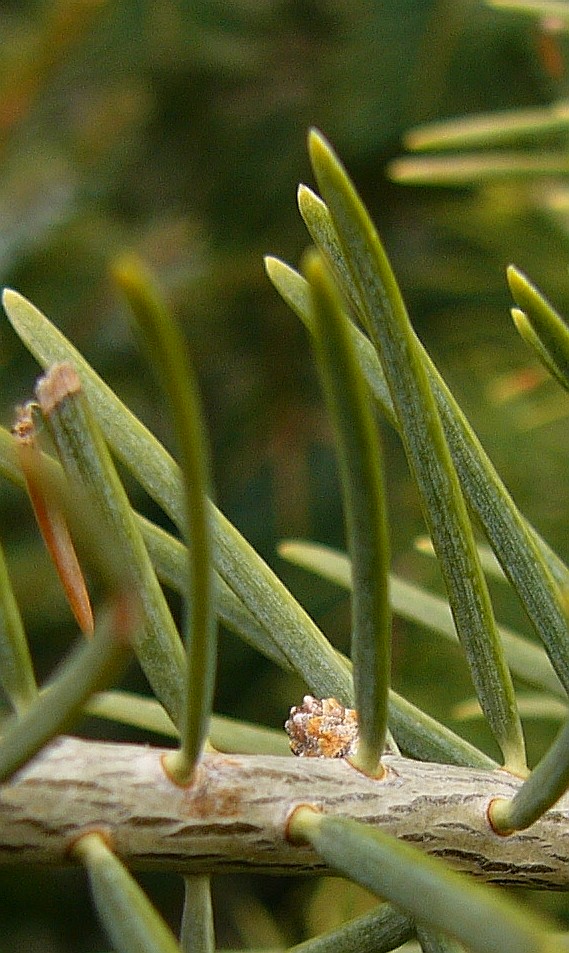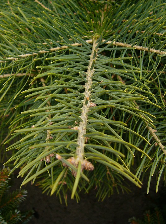 Nadeln blaugrün, sehr dicht stehend, die Zweigoberseite verdeckend