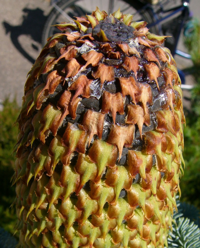 Weibliche Zapfen 10 bis 15 cm lang, 4 - 5 cm dick, jung grün, mit rötlichem oder violettem Reif