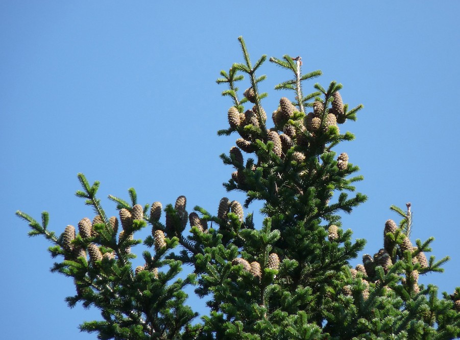 Weibliche Zapfen aufrecht, 3 - 5 cm lang, auf der Oberseite von kräftigen vorjährigen Trieben