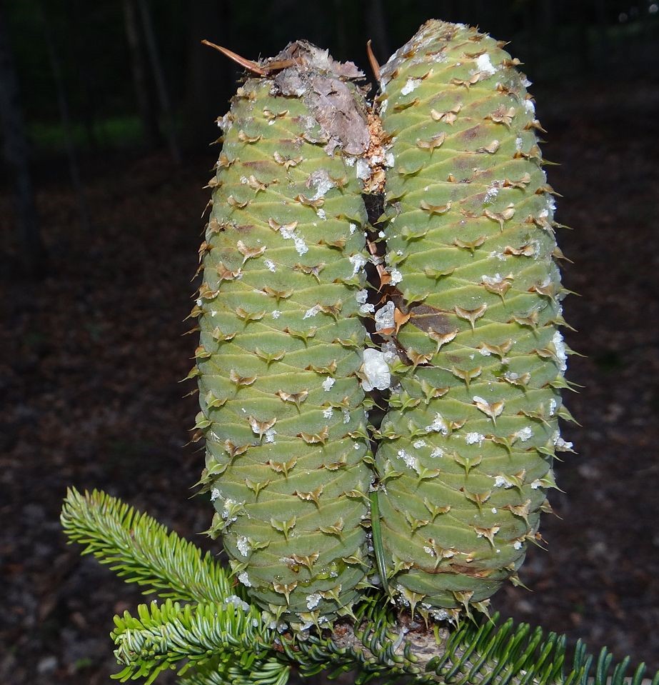 Zapfen reifen im Herbst des Blütejahres, aufrecht wachsend, 10 - 16 cm lang, jung grünlich, reif braun,