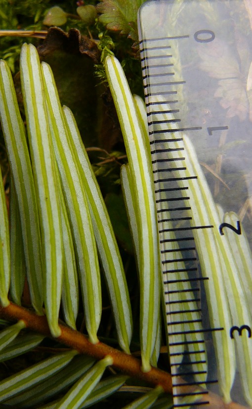 Nadeln unterseits mit 2 weißen Bänden, spitz oder stumpf, nicht stechend, 3,5 - 6 cm lang