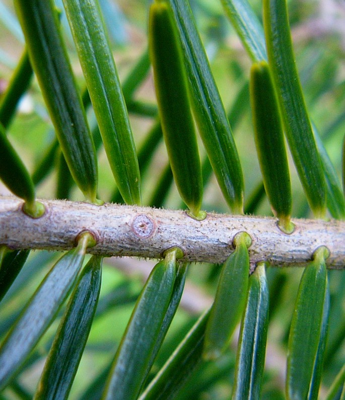 Männliche Zapfen gelblich oder rot, meist hängend, auf der Zweigunterseite der vorjährigen Triebe im mittleren und unteren Kronenbereich