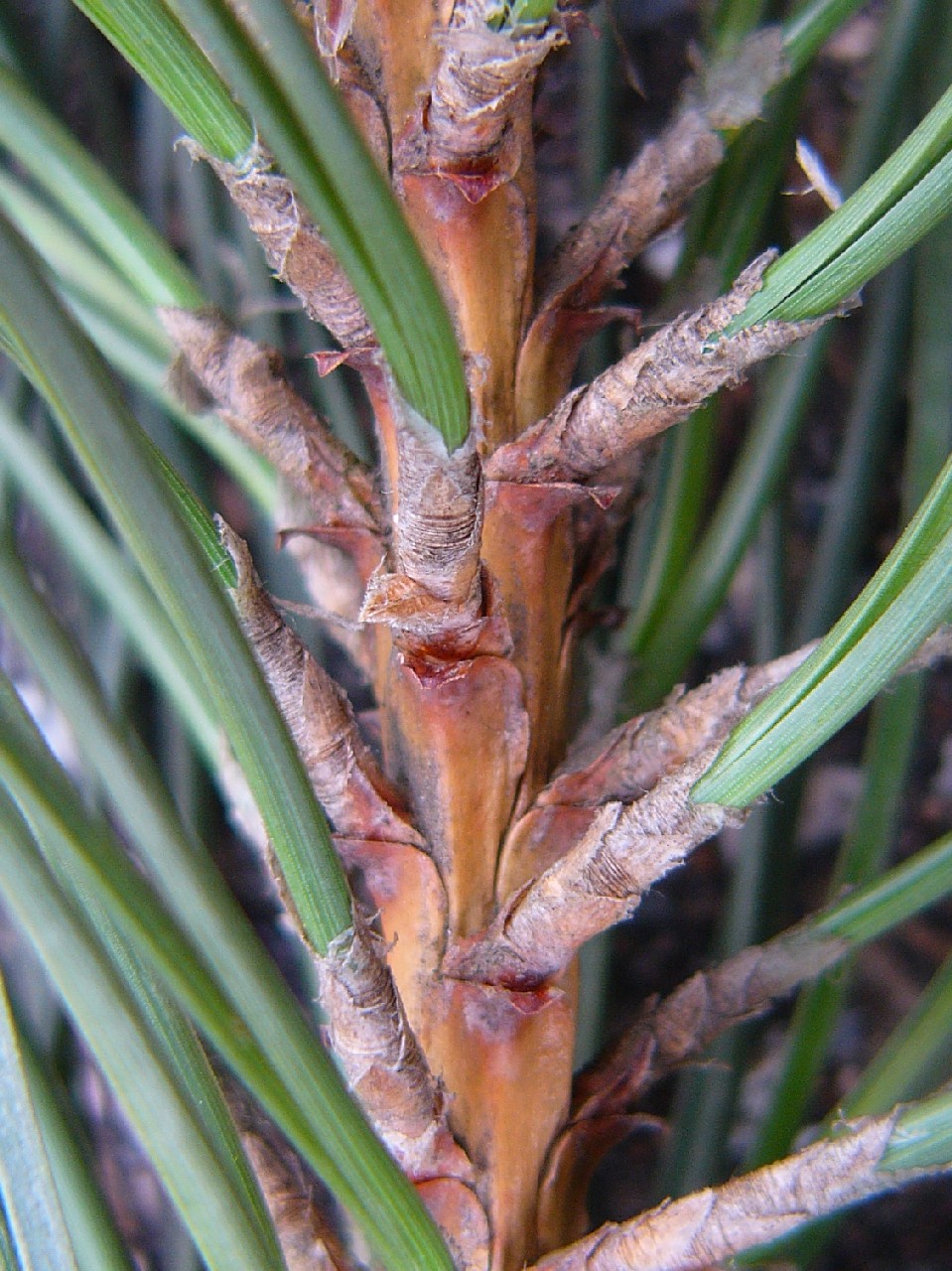 Nadeln zu 2, 6 - 10 cm lang, steif, stechend, zum Zweig hin gekrümmt