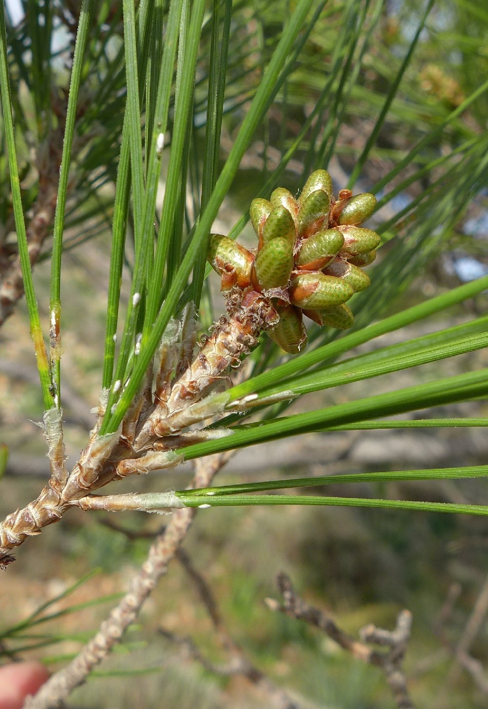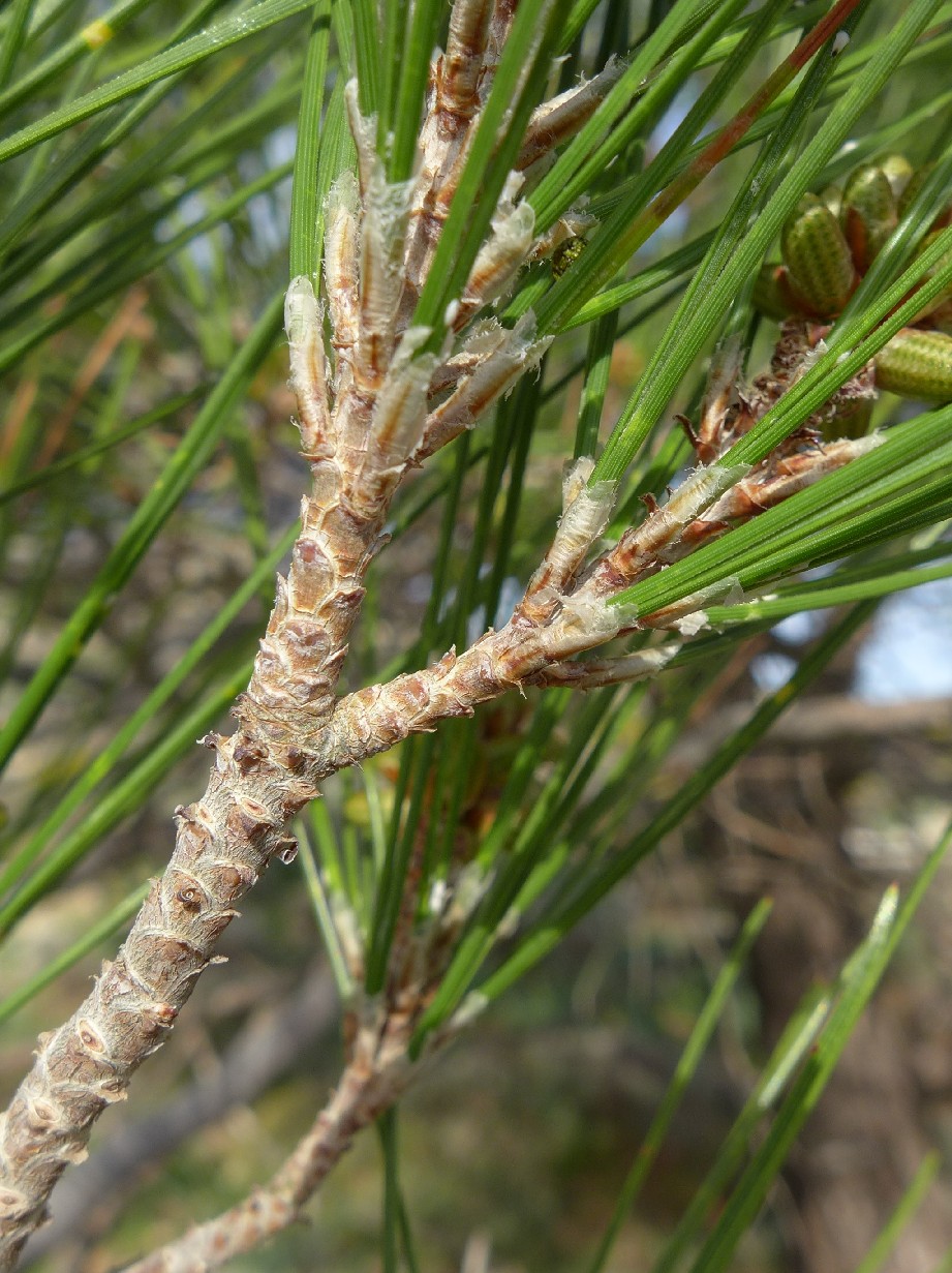 Knospen 0,5 - 1,5 cm lang, harzlos, zylindrisch, Schuppen an der Spitze lockig eingerollt Nadeln hellgrün, 11 - 16 cm lang, zu 2, gerade