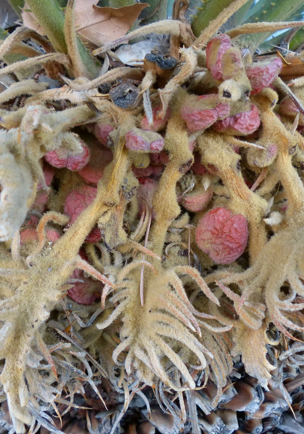Weibliche Blütenstände bestehen aus umgeformten Blättern, die in einem Kranz an der Spitze der Pflanze abwechselnd mit den Laubblättern gebildet werden