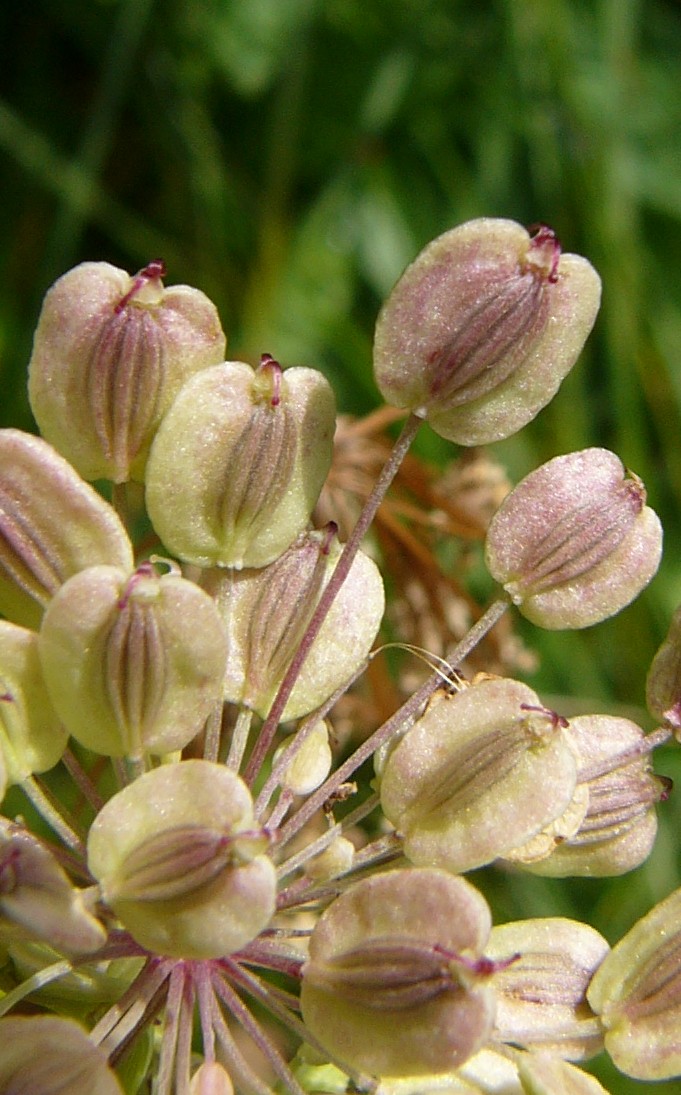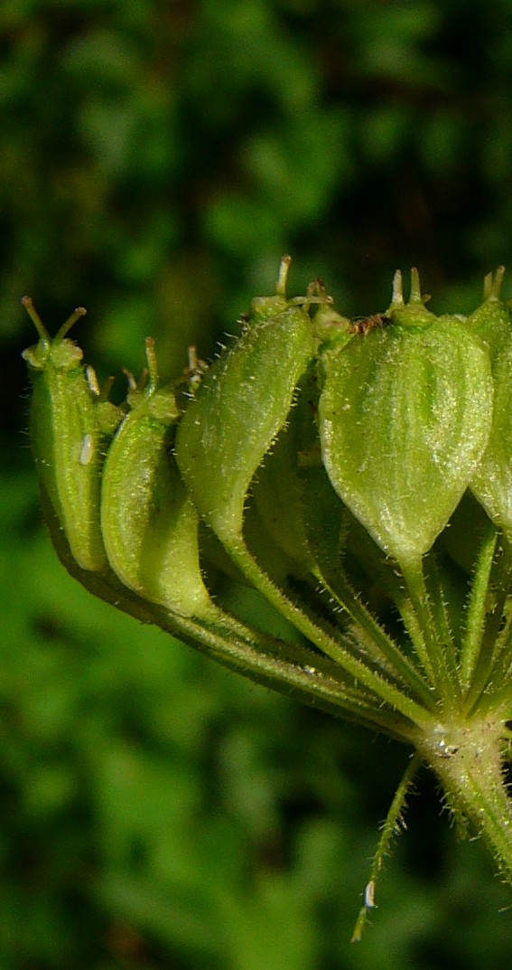 Pflanze behaart Randblüten vergrößert, junge Früchte behaart > Heracleum (Bärenklau) |