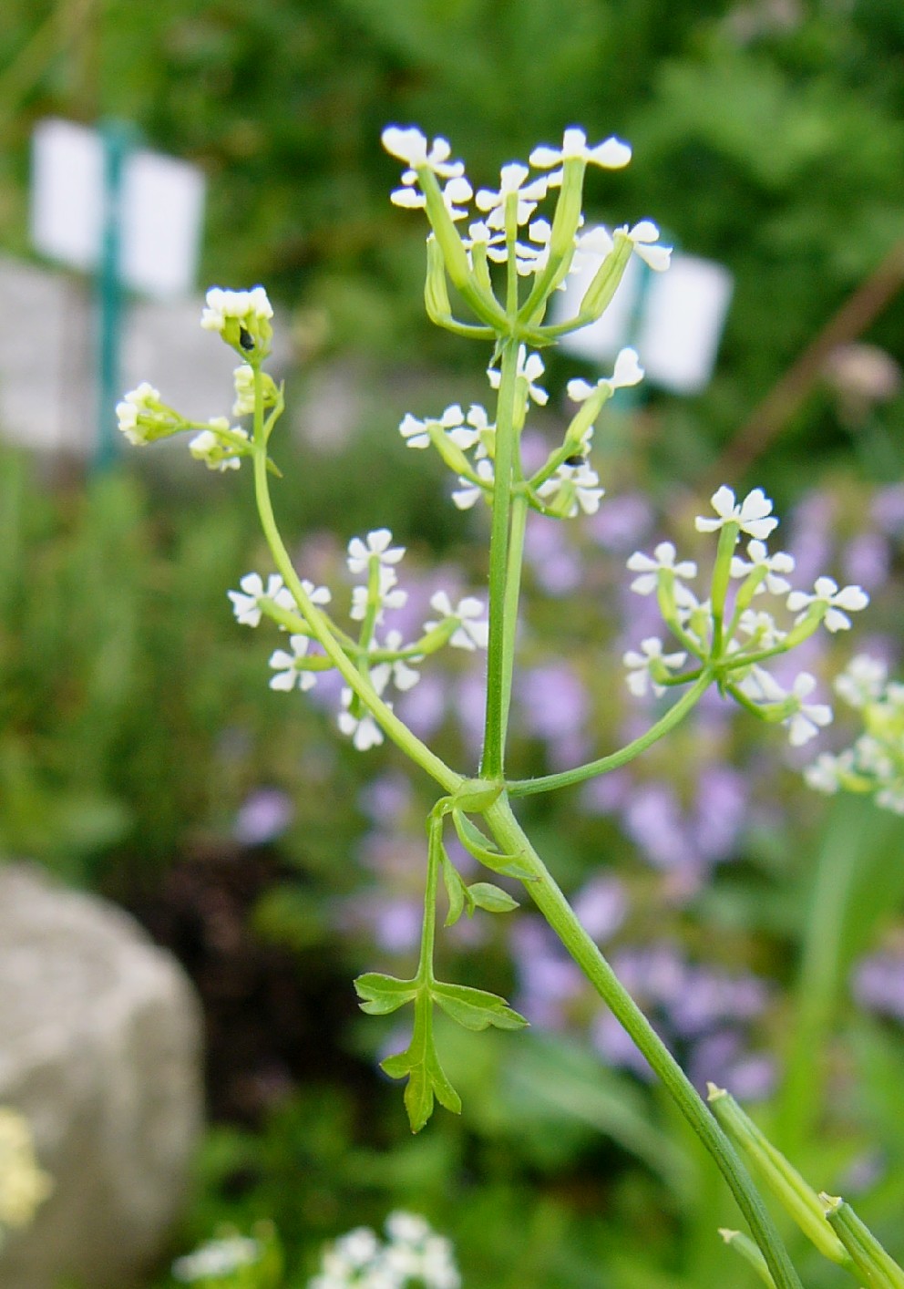 Apiaceae - Blüten weiß, Dolde ohne oder mit wenigen Hüllblättern, Frucht kahl, Stängel kahl, Blätter mehrfach gefiedert, Blättchen fiederschnittig, Fiederabschnitte kurz