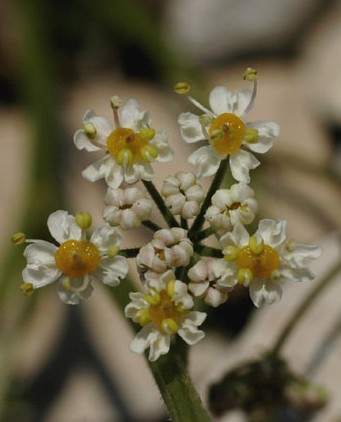 Blüten weiß oder rosa Früchte eikugelig, nicht geschnäbelt > Selinopsis foetida