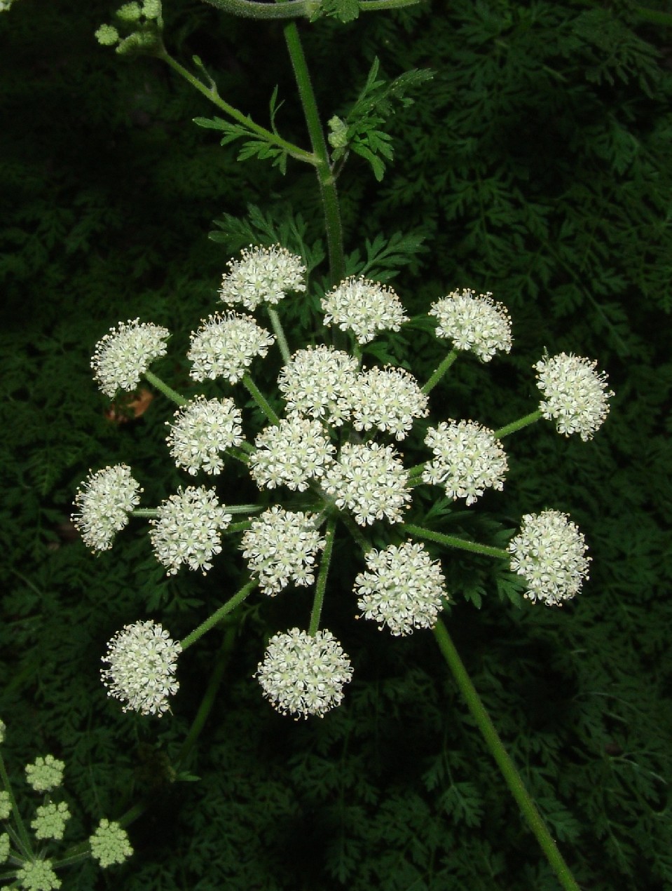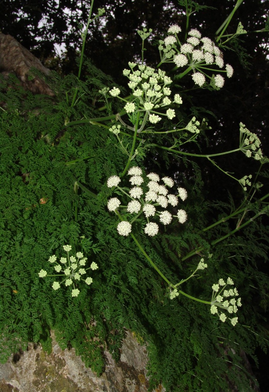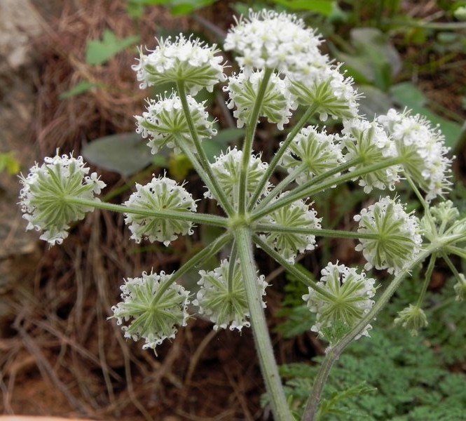 Blüten weiß, Dolde mit 10 - 20 Doldenstrahlen, Döldchen halbkugelig Doldenstiele behaart, Dolden mit wenigen,