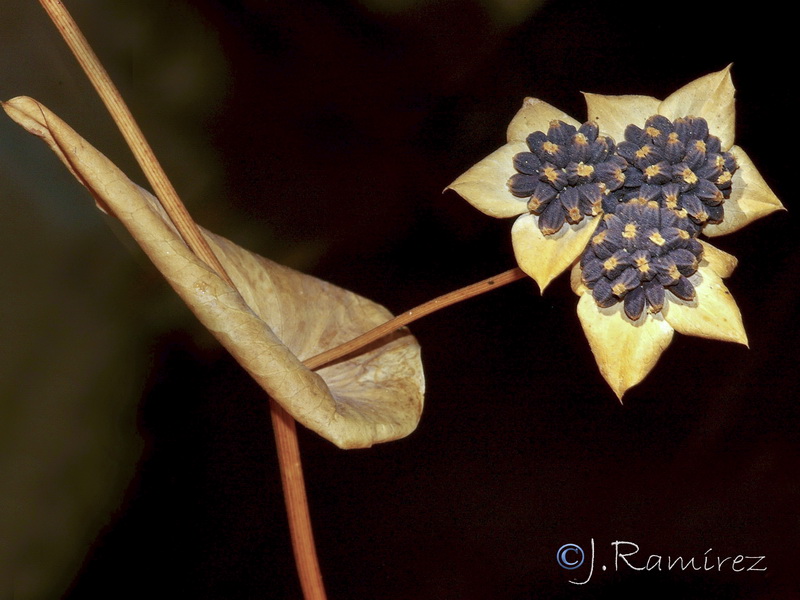 Blüten gelblich, 5 nach innen gerollte Kronblätter, 5 Staubblätter