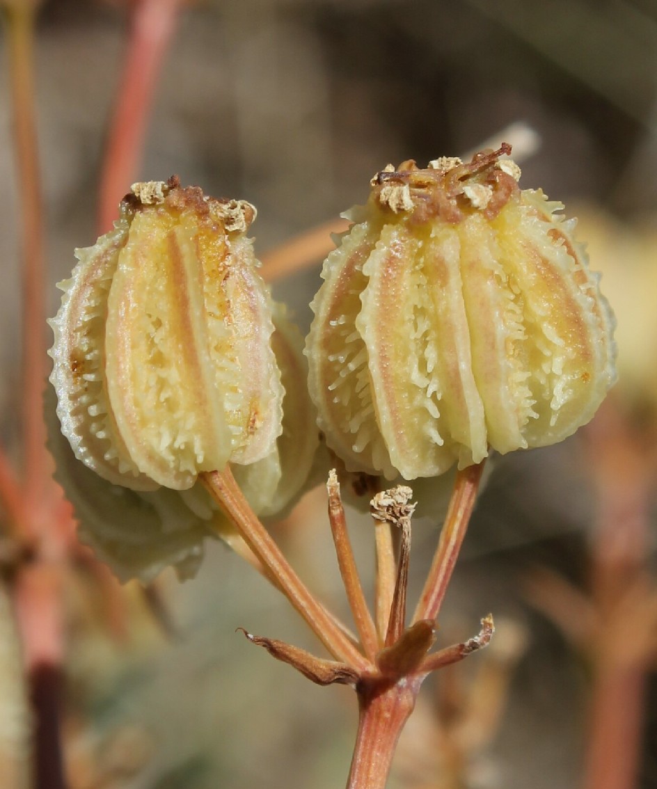 Früchte kugelig, 12 - 17 mm lang, mit scharfen Graten, die warzig- gezähnt sind