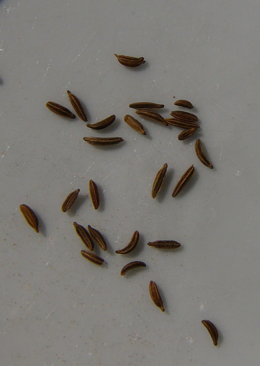 Früchte eiförmig, gerippt, kahl, 3 - 3,5 mm lang, Griffel 0,5 - 1 mm lang, etwas länger als das konische Griffelpolster, Früchte beim Zerreiben intensiv nach Kümmel riechend Griffel meist umgebogen oder waagrecht zum Griffelpolster