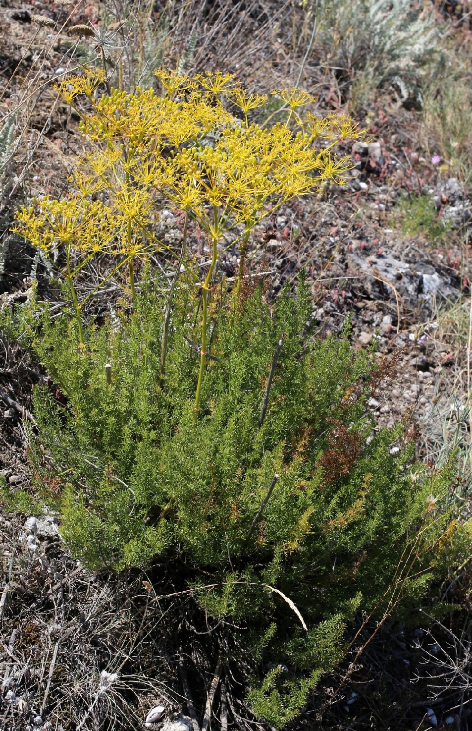 Döldchen mit 10 - 13 Blüten und 6 Hüllchenblättern, Döldchenstrahlen ungleich, 5 - 10 mm lang Hüllchenblätter lanzettlich, 3 mm lang 1 mm breit, Kronblätter dottergelb, nach innen gerollt Früchte fast kreisrund, 10 - 17 mm lang, 7 - 8 mm
