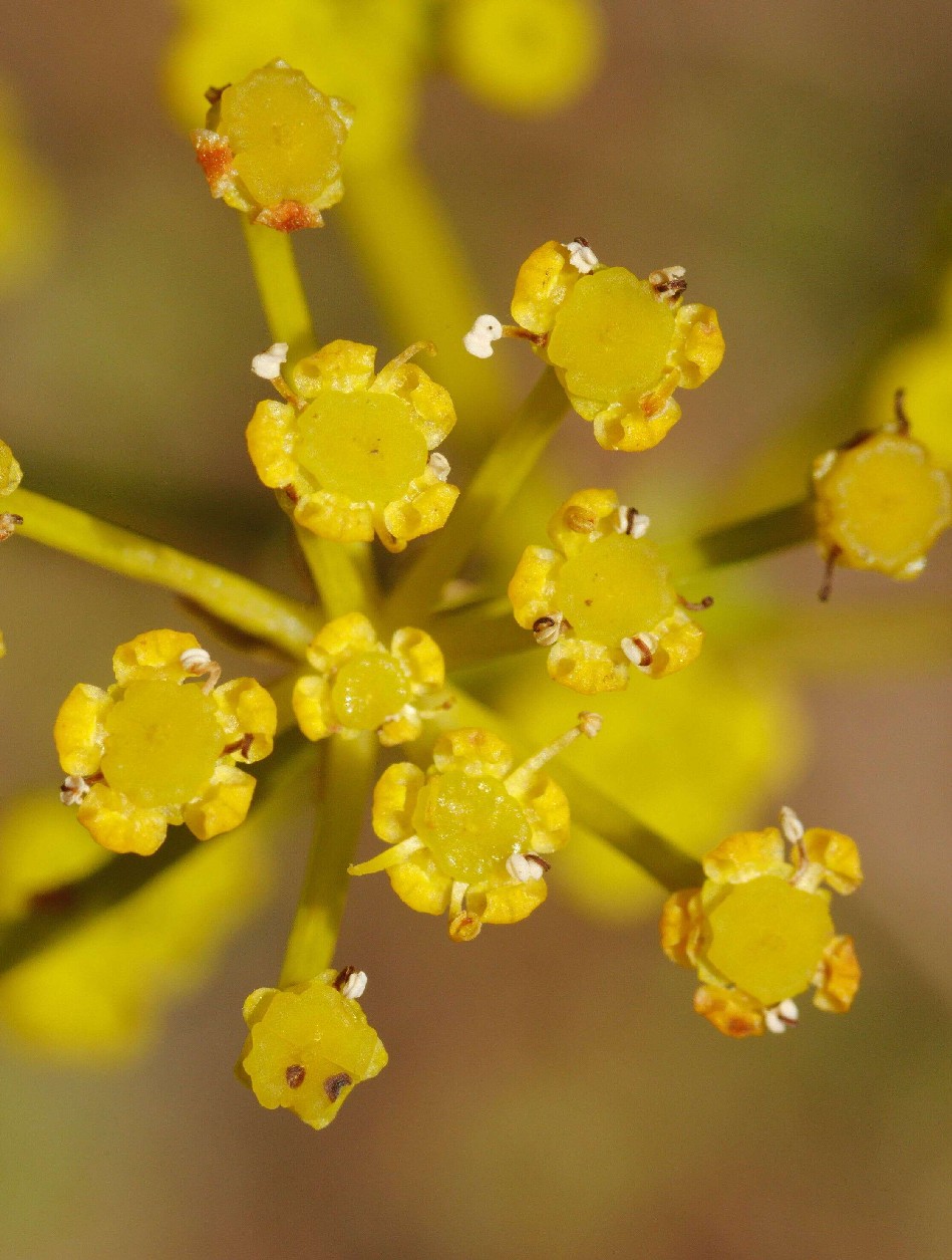 Dolden mit 11 - 18 Doldenstrahlen und mehreren Hüllblättern, Doldenstrahlen, bis 5 cm lang, Hüllblätter lanzettlich, 7 - 10 mm lang, 2 - 3 mm breit, hautrandig, nach unten geschlagen, Hüllchenblätter zahlreich, kleiner als die Hüllblätter, Kelchzähne bis 0,5 mm lang