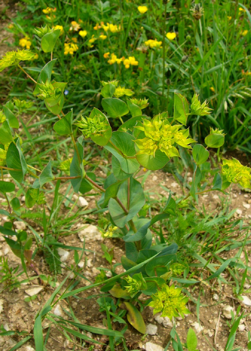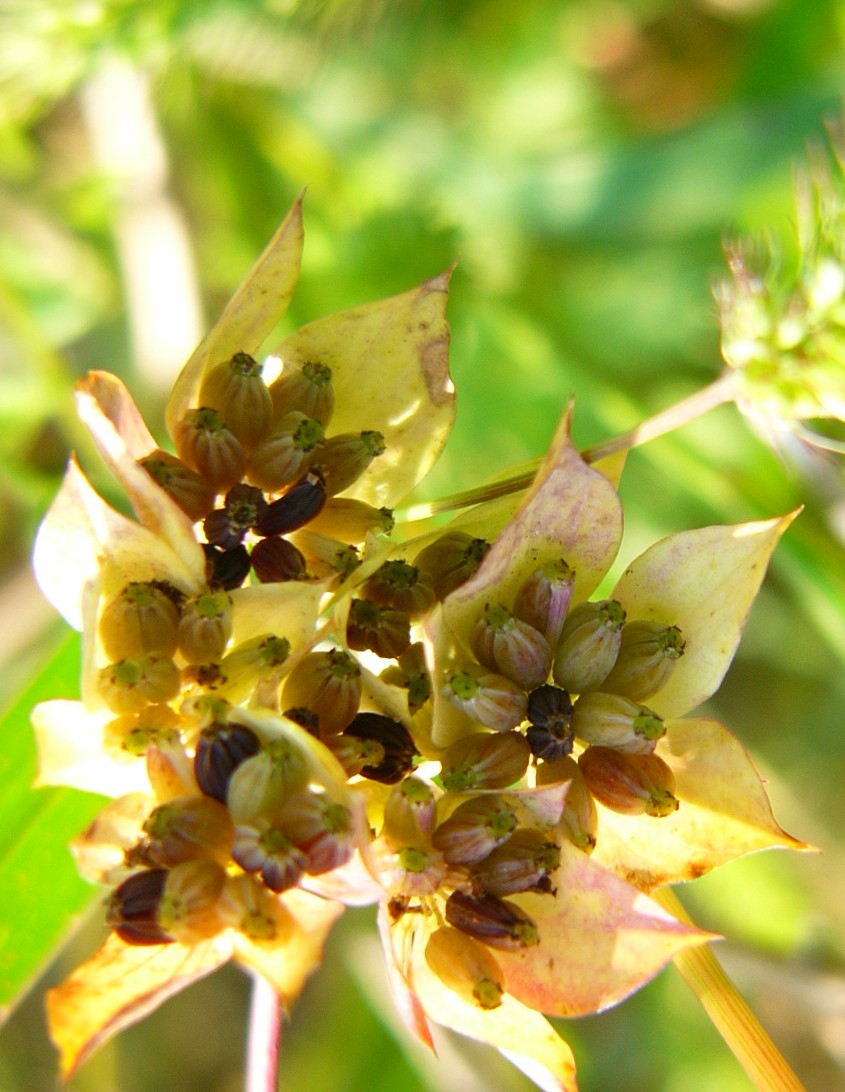 Blüten gelb, 5 nach innen gekrümmte Kronblätter, Kelchblätter manchmal fehlend, 5 Staubblätter, Fruchtknoten unterständig, aus 2 Fruchtblättern Hüllblättchen eiförmig, lanzettlich oder linealisch, länger als das Döldchen