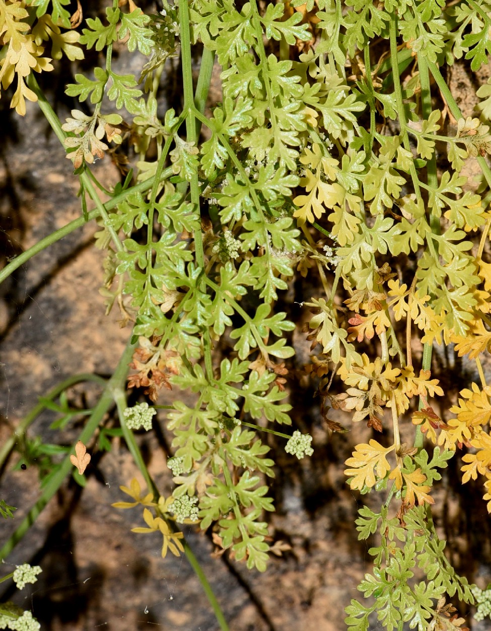 Früchte eiförmig,seitlich zusammengepresst, gerippt bis schwach geflügelt, kahl, 2 - 2,5 mm lang, Griffelpolster 0,5 mm lang, konisch, Griffel 0,5 - 1 mm lang, spreizend, länger als das Griffelpolster, Kelchzähne undeutlich Stängel grün, 2 - 5 mm im Durchmesser, fein