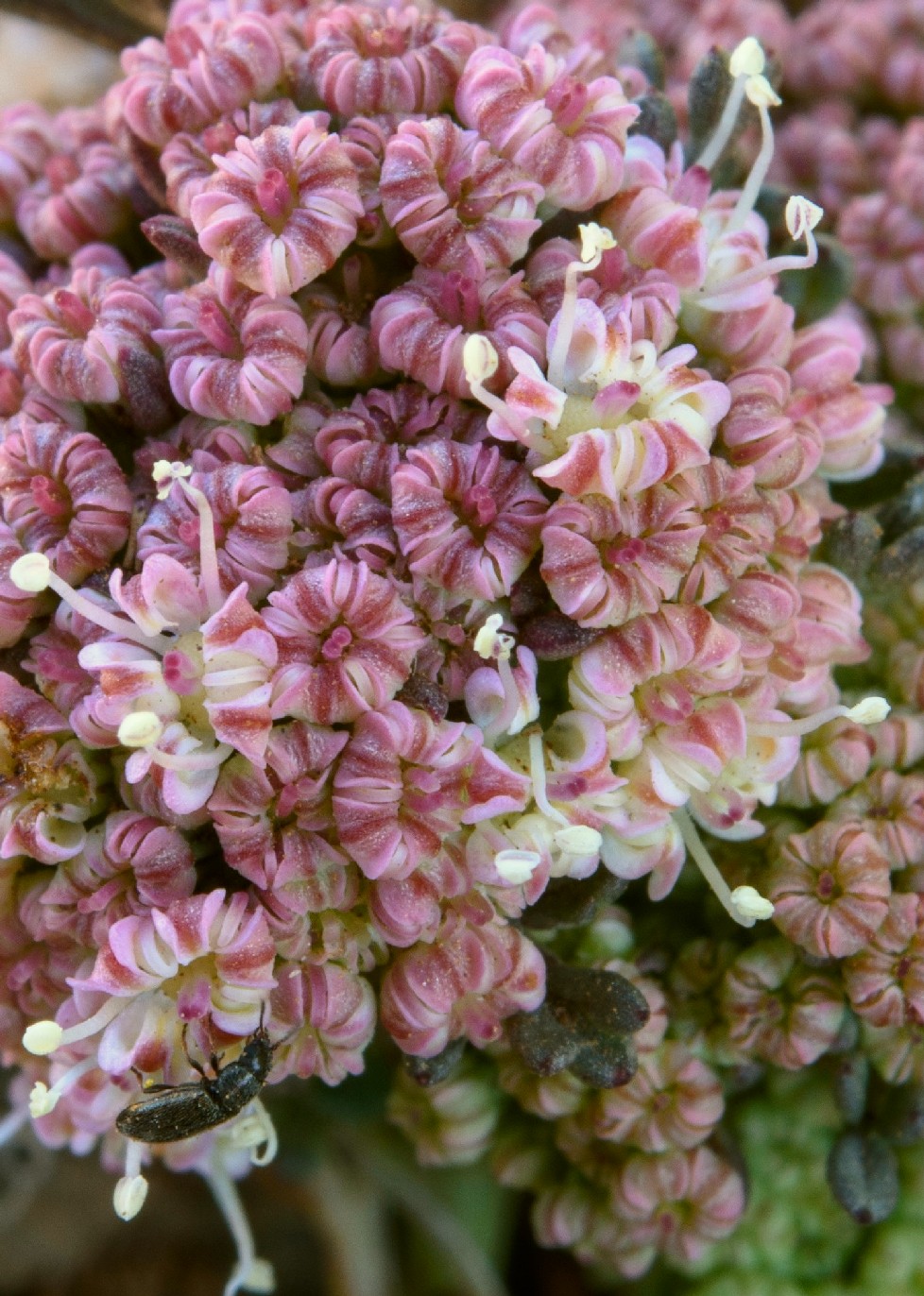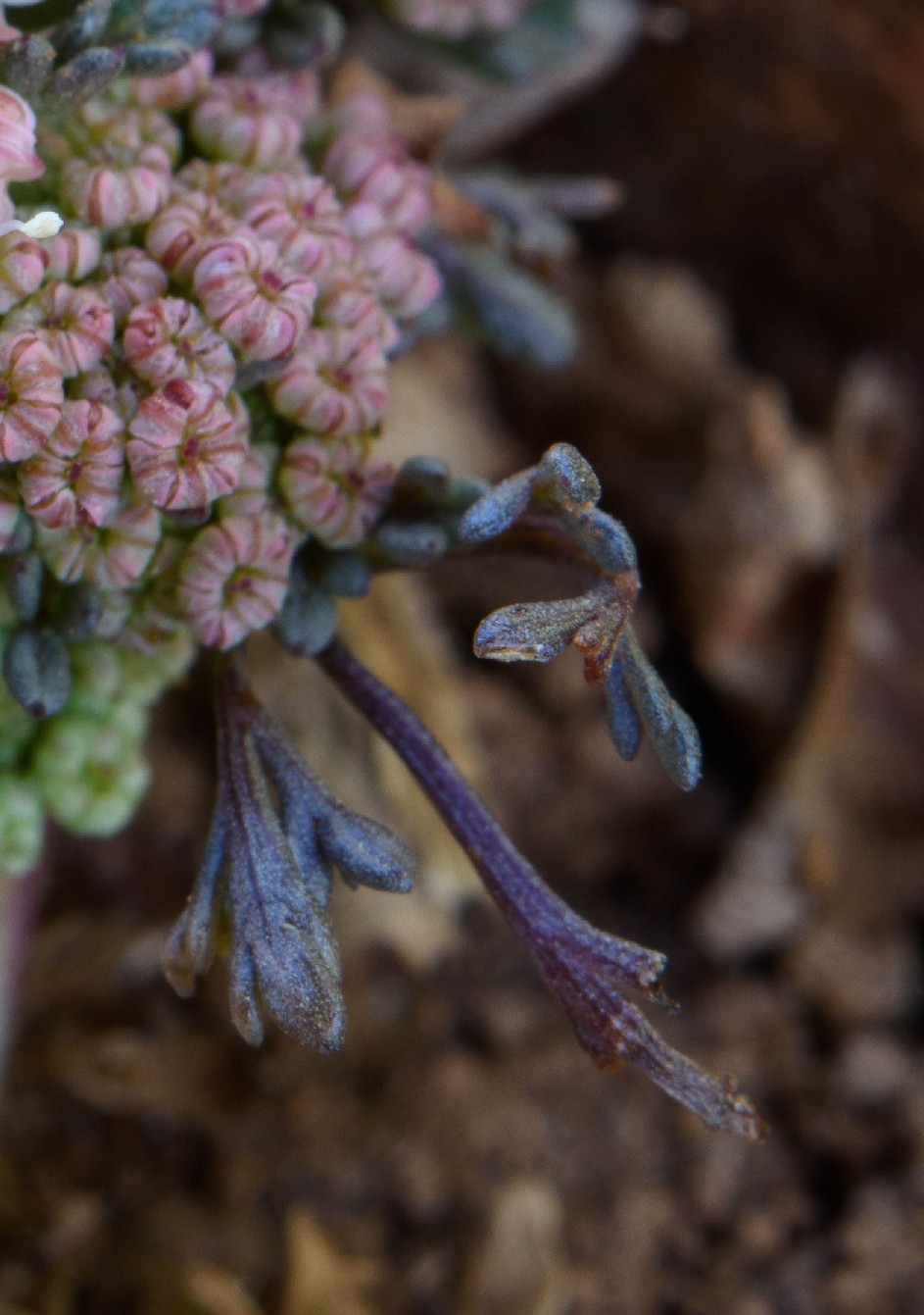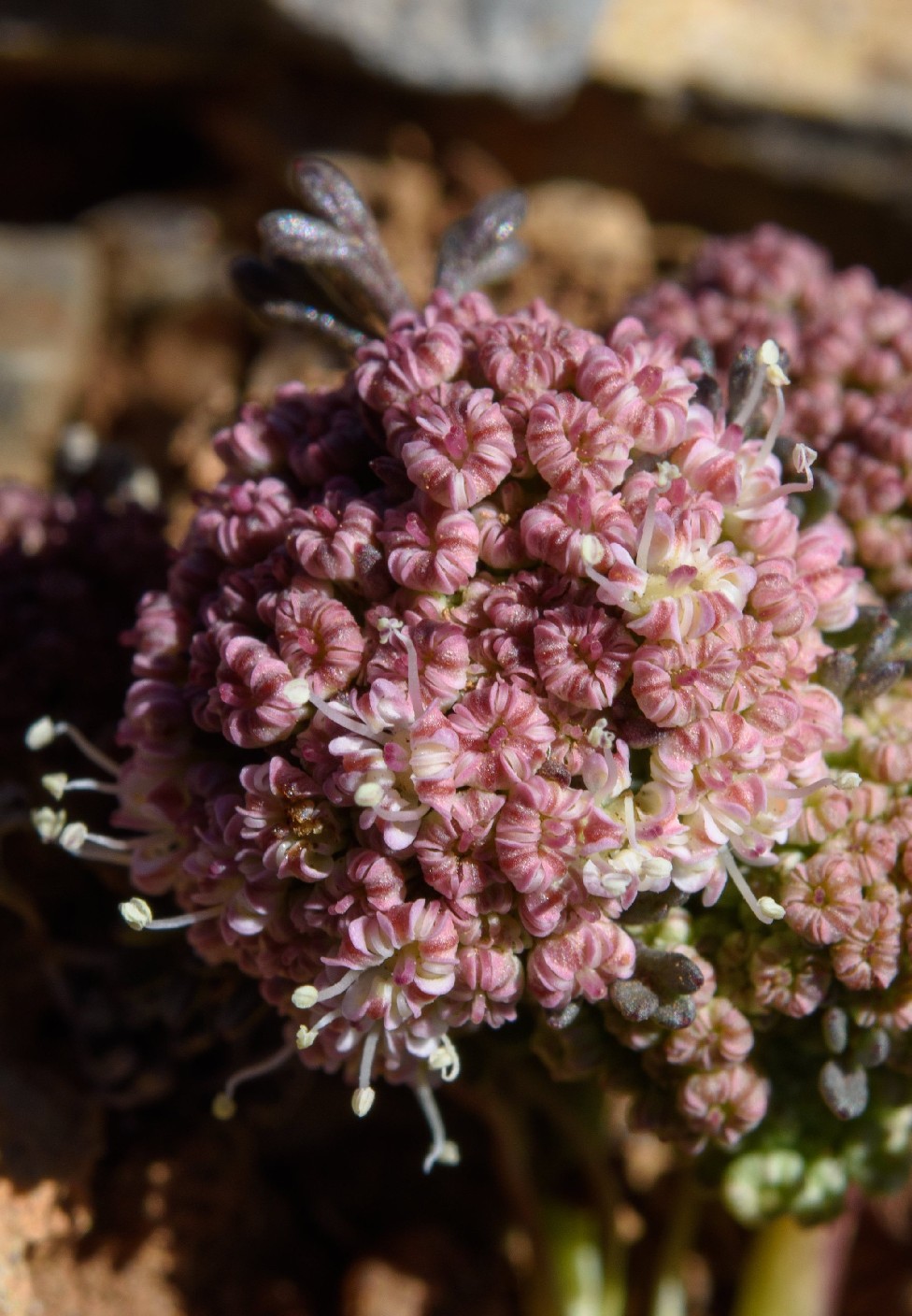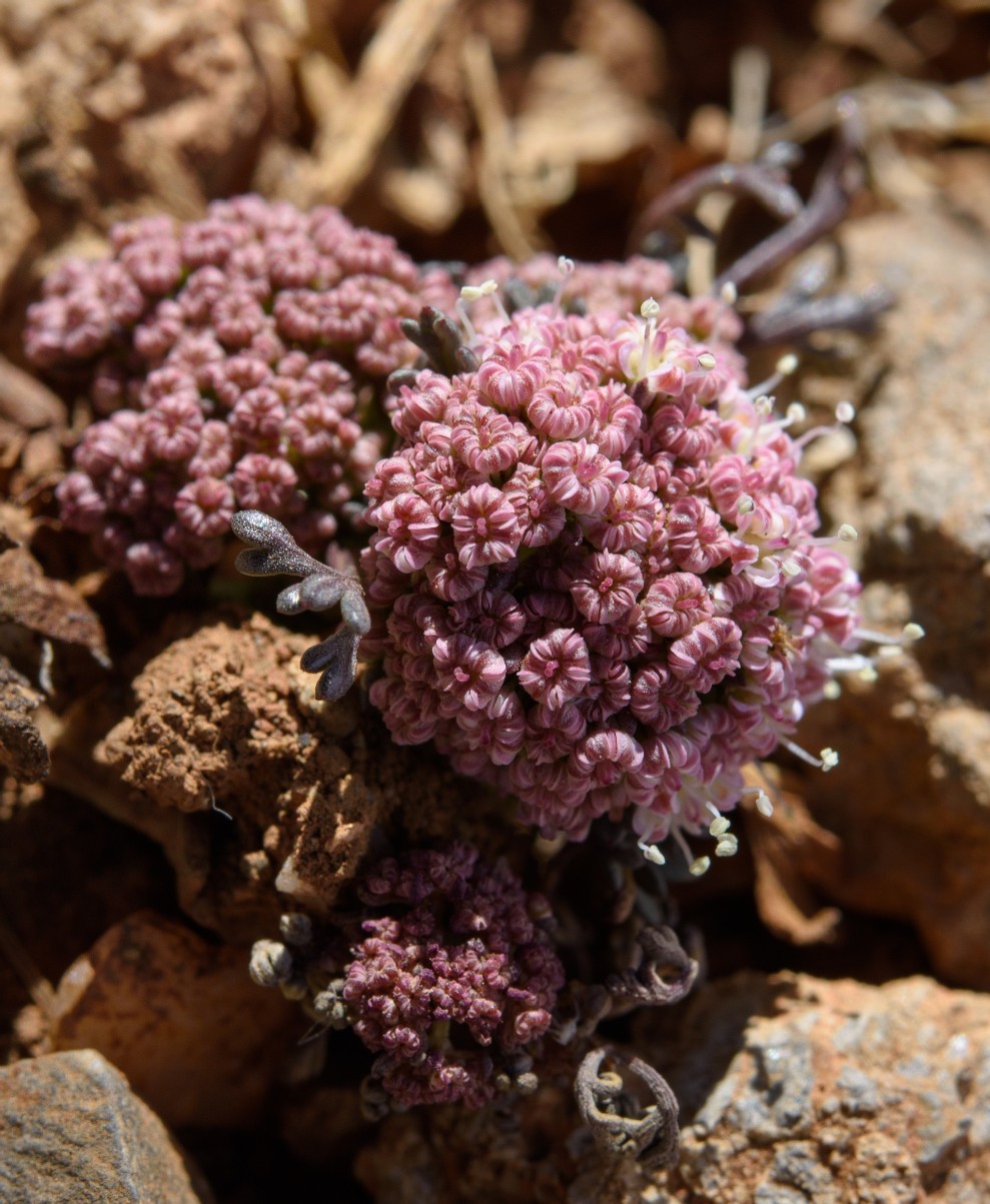Döldchen mit 6 - 15 Blüten, meist mit 6 linealischen, hautrandigen, 1,5 mm langen Hüllchenblättern, Blütenstiele kräftig, Kronblätter rosa, oft mit weißem Rand, nach innen gerollt, Antheren cremefarben, 0,6 mm lang, Kelchzähne undeutlich oder fehlend, Griffelpolster breit konisch, Griffel 2 - 3 mal so lang wie das Griffelpolster