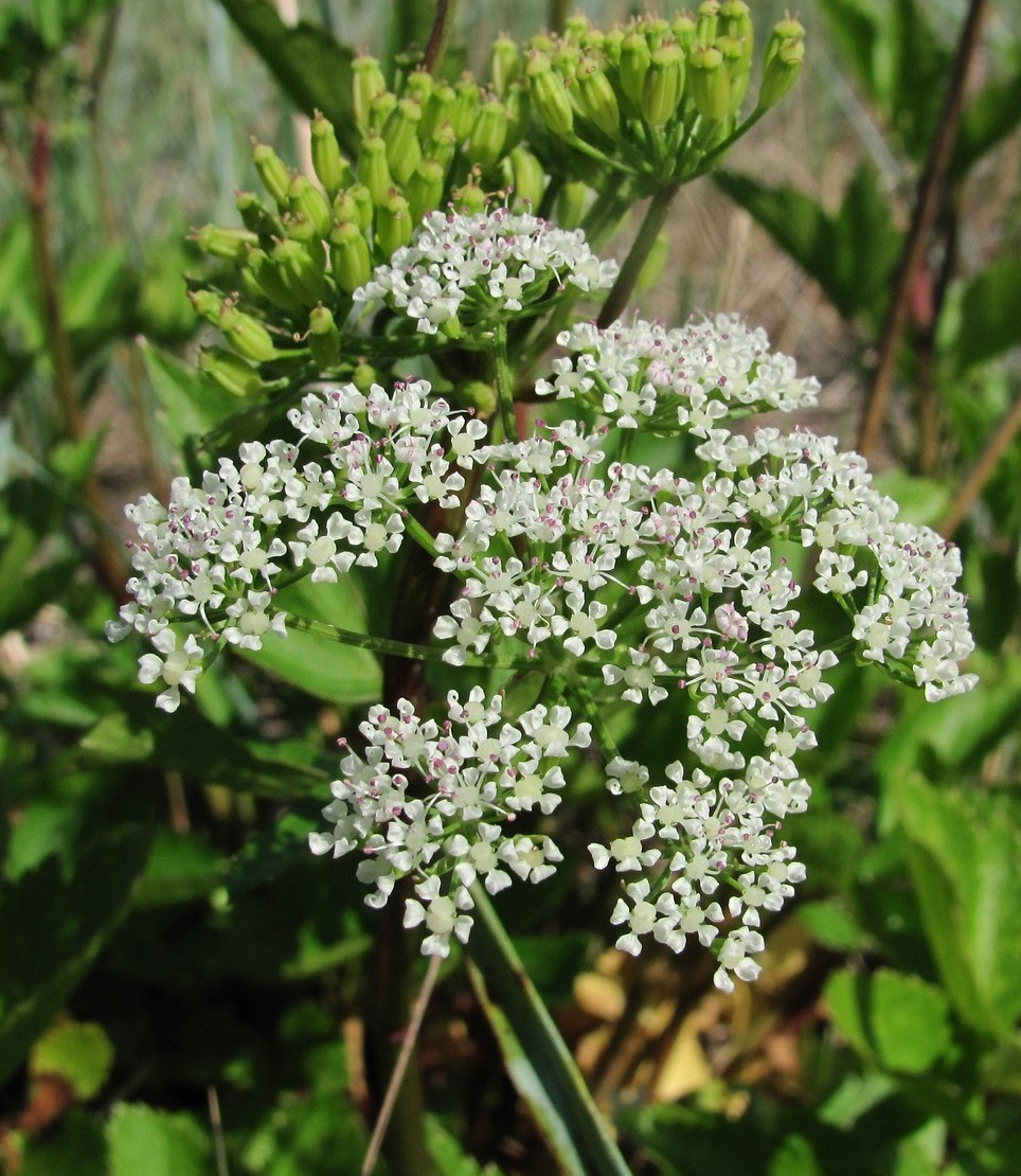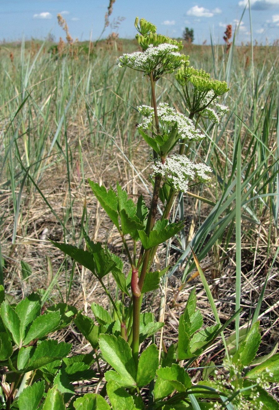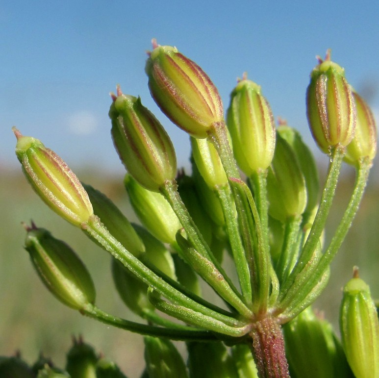 Stängel kahl, hohl und rippig, rötlich, meist unverzweigt
