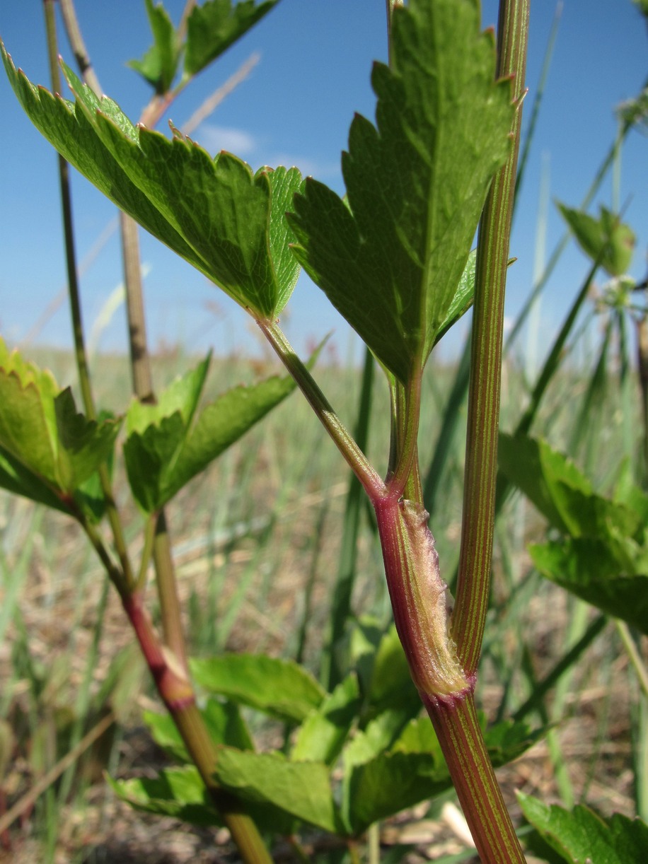 Stängelblätter aus 3 fiederteiligen Blättchen, einer Blattscheiden entspringend