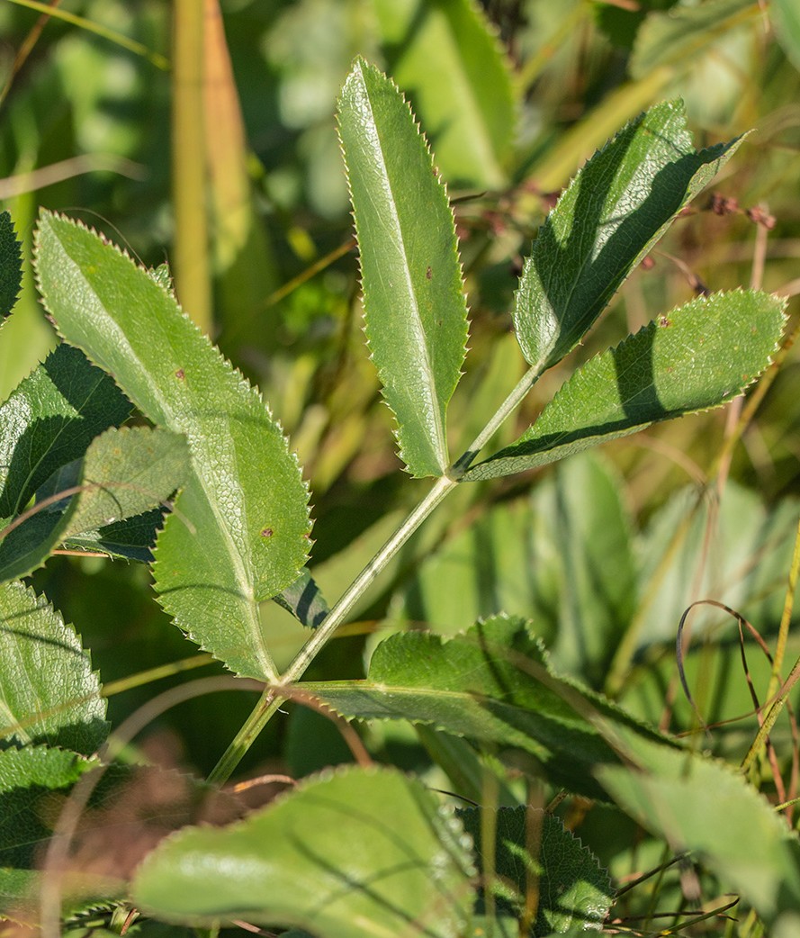Obere Stängelblätter 3- 5- teilig, Blattscheiden aufgeblasen Untere Blätter einfach gefiedert, Blättchen 30 - 60 mm lang, scharf gesägt
