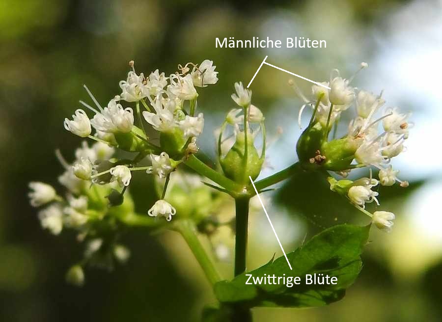 Basale Blüte sitzend und zwittrig, die 2 - 4 männlichen Blüten mit ca. 3 mm langen Blütenstiel, der mit der basalen Blüte verwachsen ist, Kronblätter weiß, Hüll- und Hüllchenblätter pfriemlich, Kelchzähne deutlich
