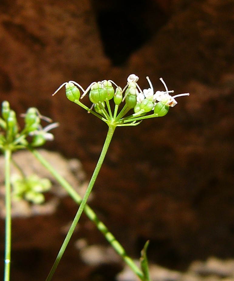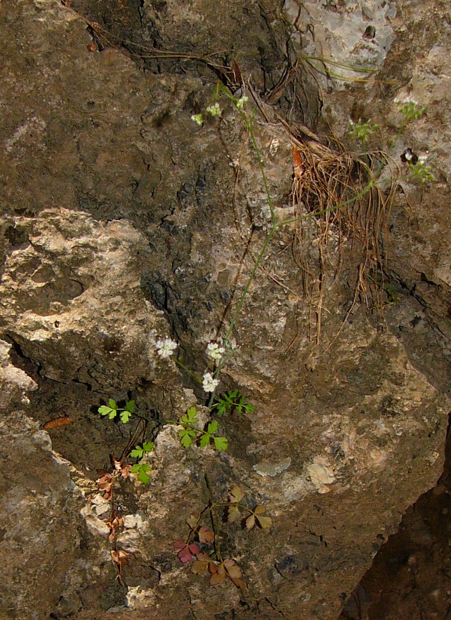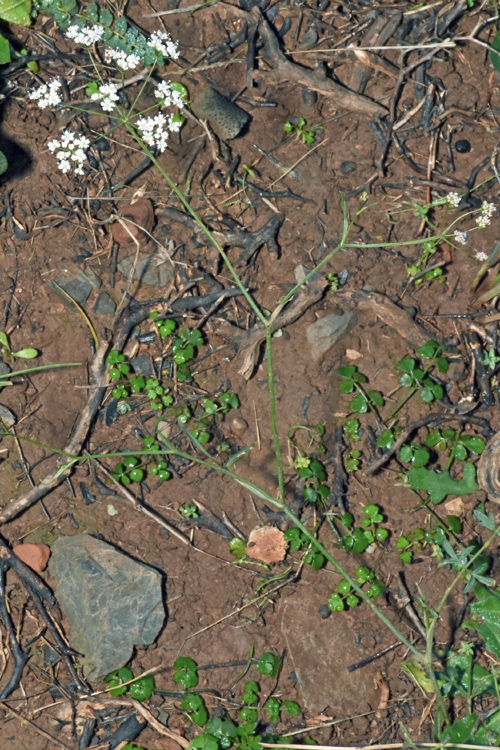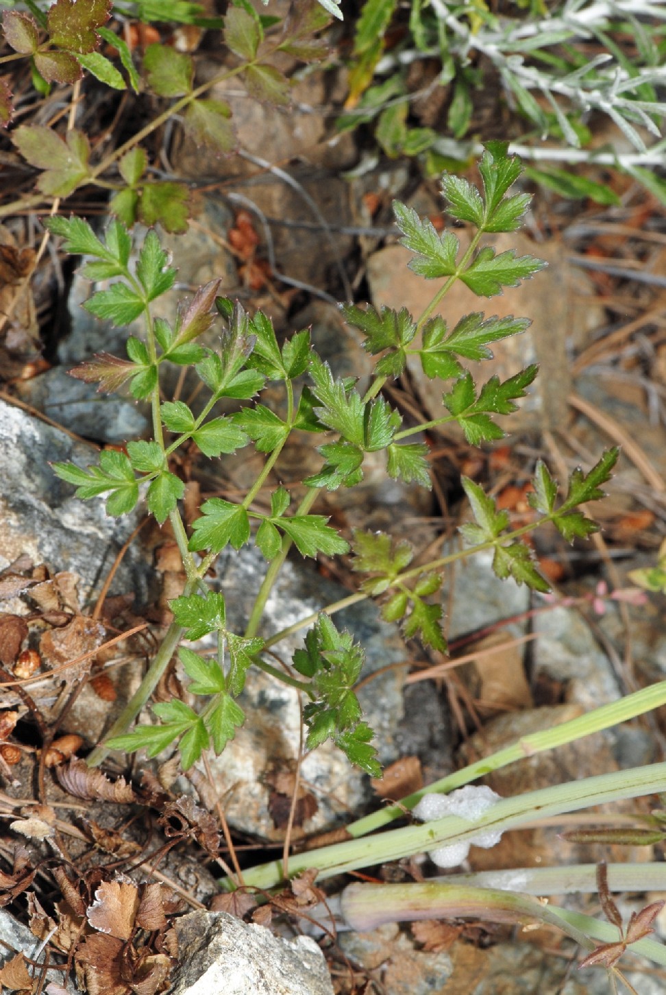 Früchte eiförmig, c. 1,5 mm im Durchmesser, am Grund herzförmig Stängel aufrecht, schlank, gestreift, kahl Grundblätter 2 - 3- fach dreiteilig gefiedert, im