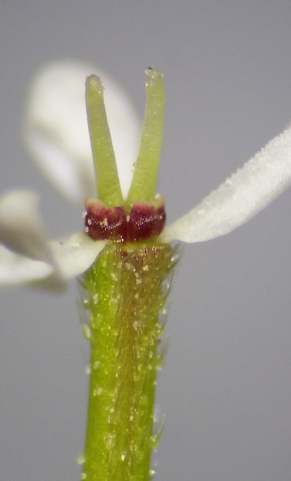 Blüten weiß, spitz, oft nach innen gerollt, äußere Kronblätter 1 - 2,5 mm lang, innere Kronblätter 0,7 - 1, 2 mm lang, Griffel 0,5 mm lang, länger als das Griffelpolster Früchte 20 - 30 mm lang,