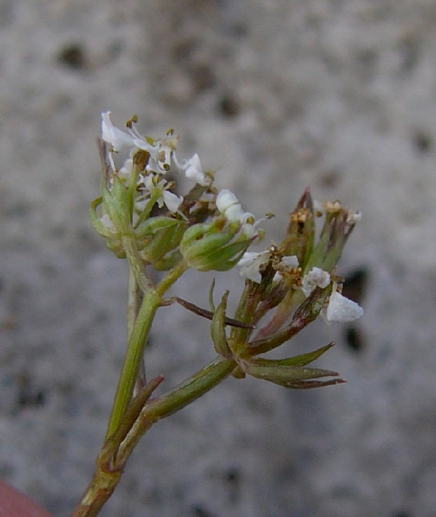 Blüten weiß, bespitzt, oft nach innen gerollt, äußere Kronblätter 2 - 4,5 mm lang, innere Kronblätter 1 - 2 mm lang