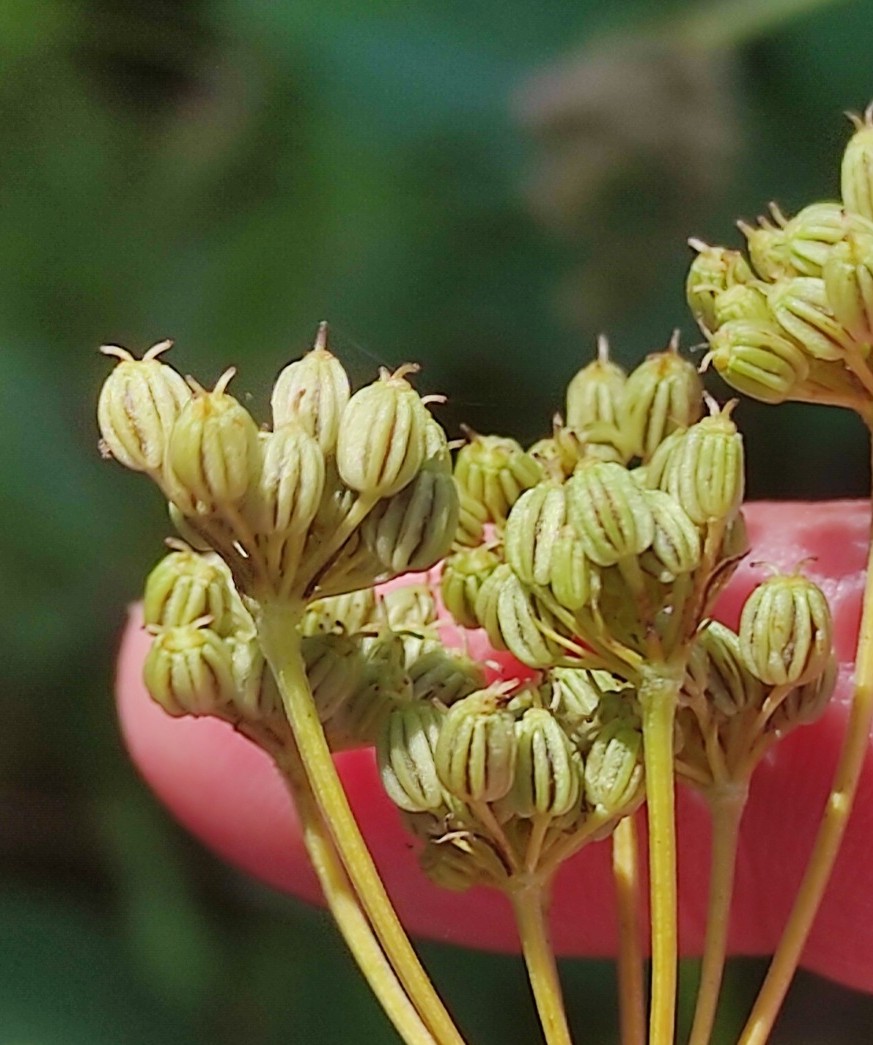 fach gefiedert, Fiederabschnitte ca. 4 mal so lang wie breit Dolden 15- 20- strahlig Früchte mit langen Griffeln, seitliche Flügel größer als die Rippen auf dem Rücken > 2 |