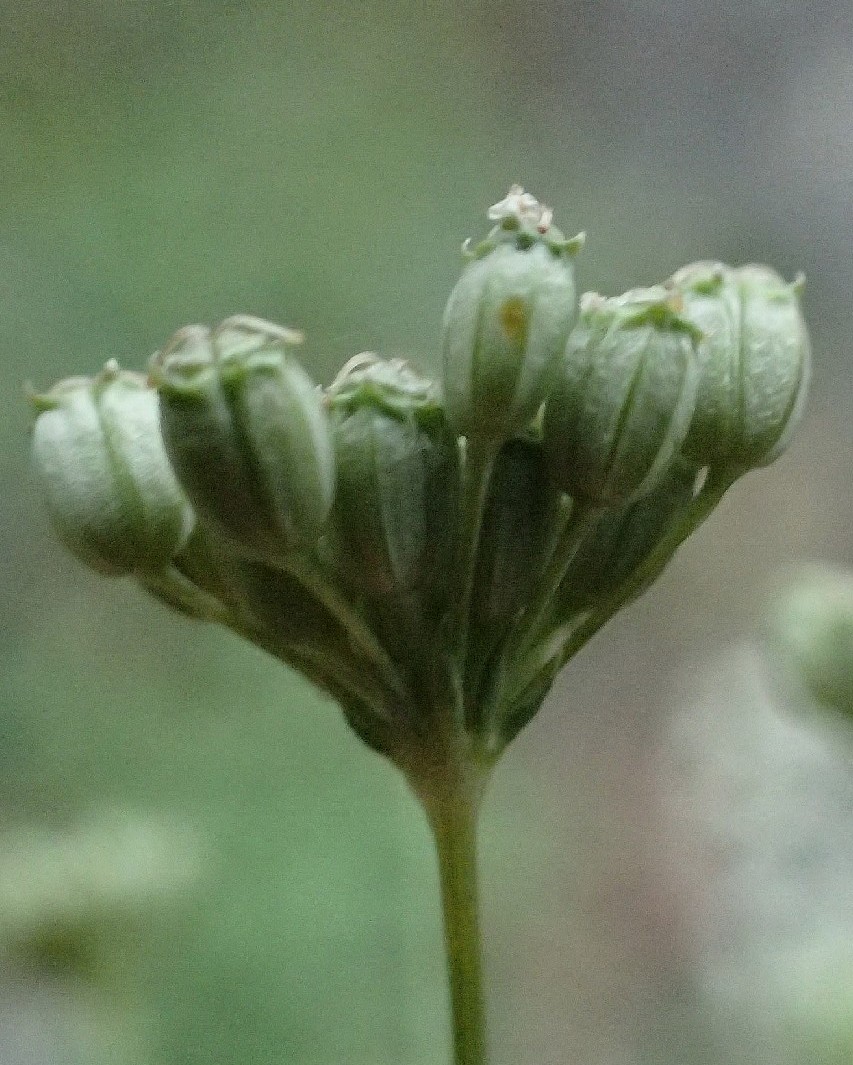 3 Früchte mit weißlichen Schüppchen, im Querschnitt mit 2 Ölstriemen zwischen je 2 Rippen